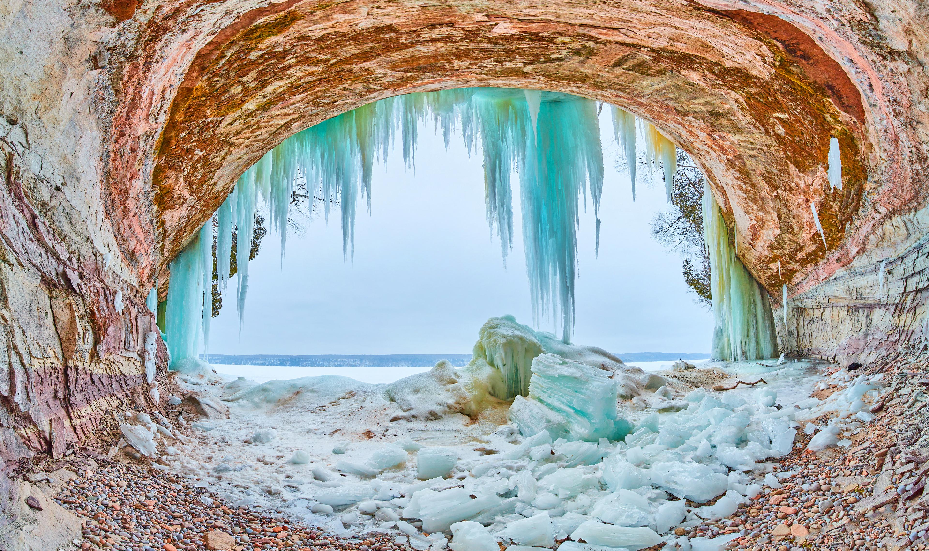 During the winter, Pictured Rocks National Lakeshore becomes a snowy wonderland with snowshoeing, cross-country skiing, snowmobiling, ice climbing, viewing ice formations, winter camping, and ice fishing. This geological masterpiece stretches 42 miles along the pristine, southern coast of Lake Superior between Munising and Grand Marais. This natural treasure was the first designated national lakeshore in the United States, established in 1966, and is one of only three national lakeshores in the country. The mineral-stained sandstone cliffs that give the park its name stretch for 15 miles along the Lake Superior shoreline. When groundwater from the cliffs’ cracks drizzles down the rocks, stunning colors appear. In addition to the rocky cliffs, there are miles of beaches, woodlands and 100 miles of trails to explore.