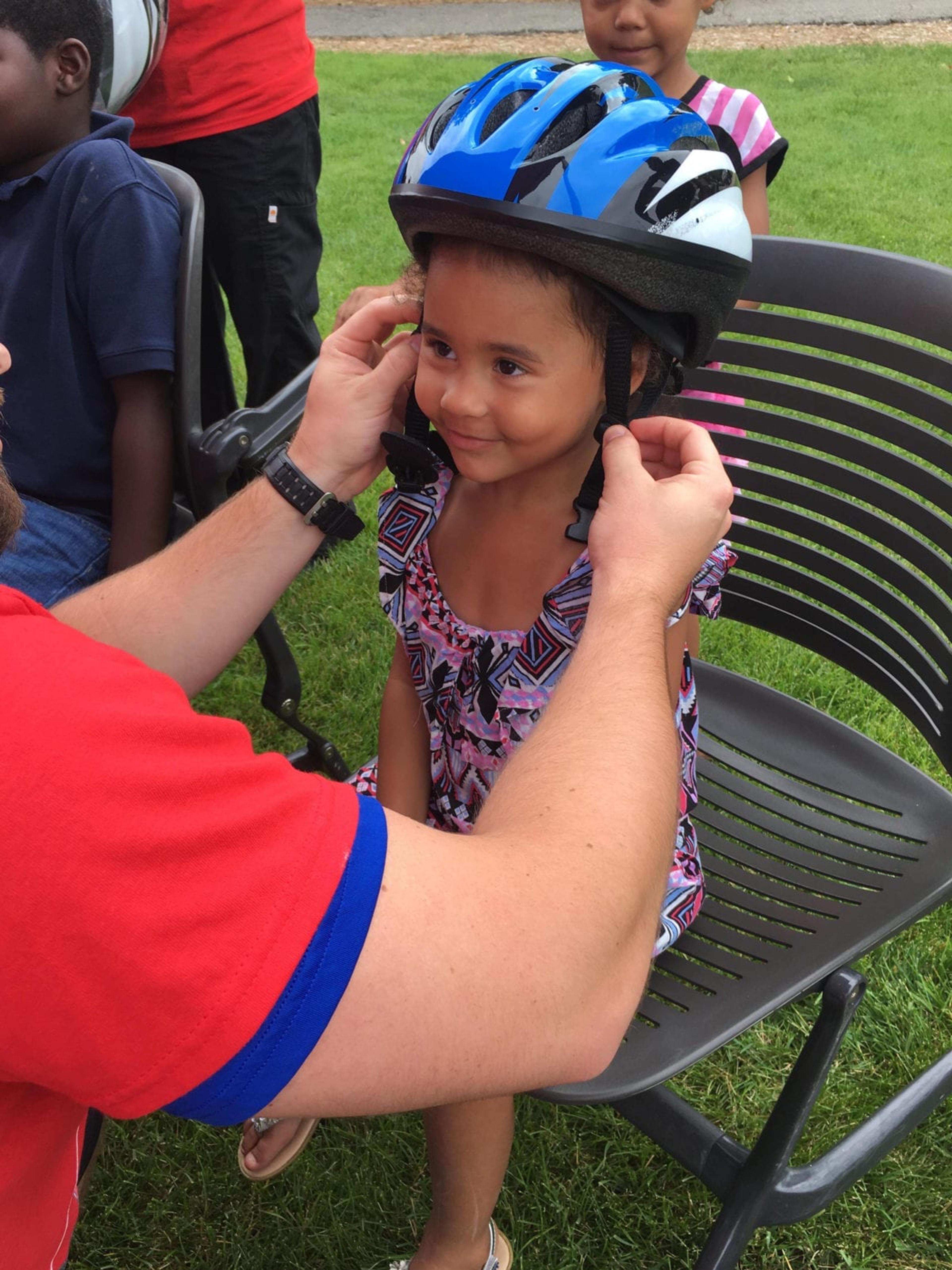 A Grand Rapids youngster gets fitted for a helmet at a recent Put a Lid On It event. Photo credit: Julie Bitely
