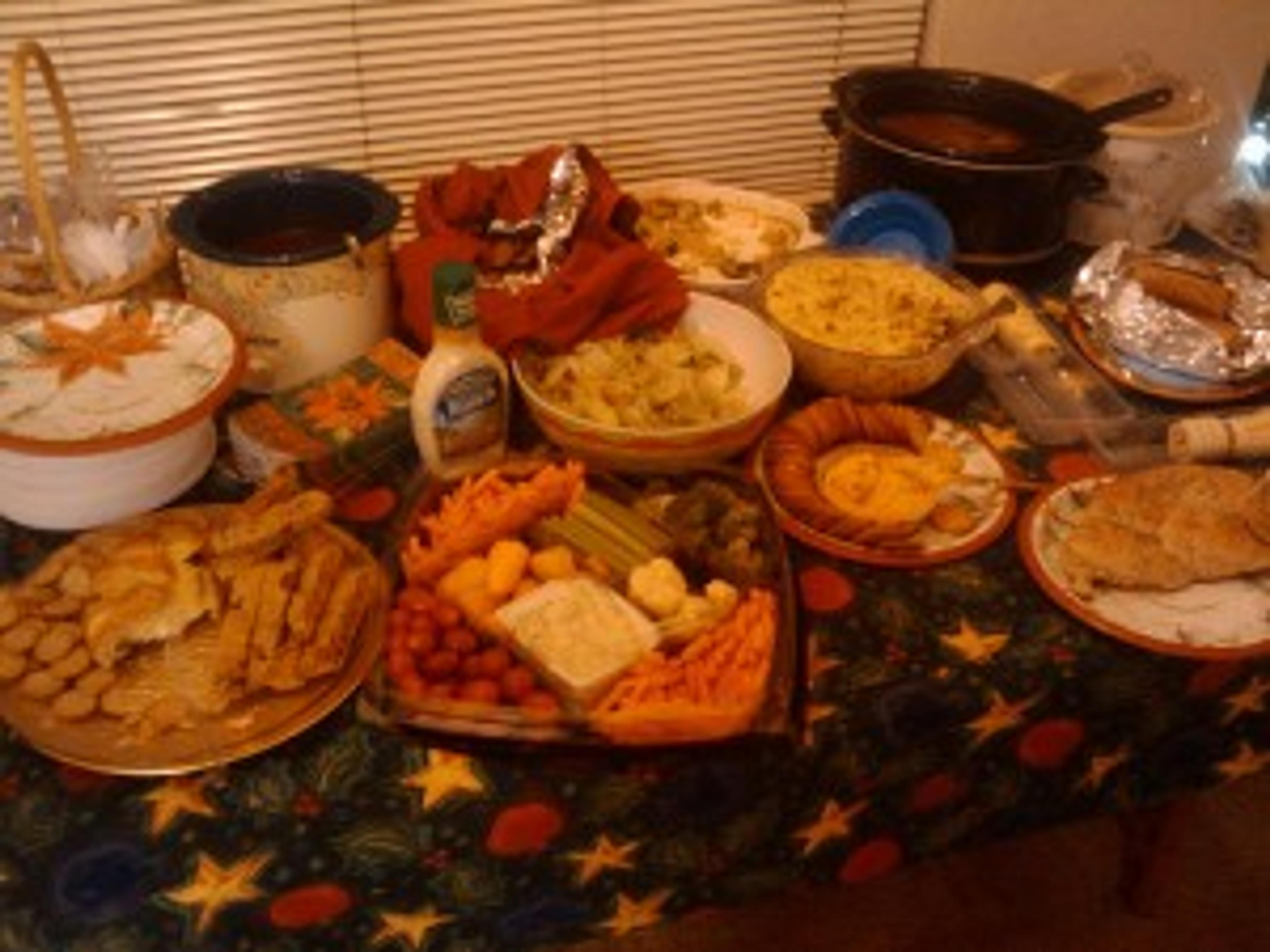 - The majority of the dishes should be small portions of appetizers and finger sandwiches. Turkey or ham wraps are popular options. A tossed green salad with veggies and a light salad dressing (lemon juice, olive oil and/or vinegar and white wine) is a wonderful choice.