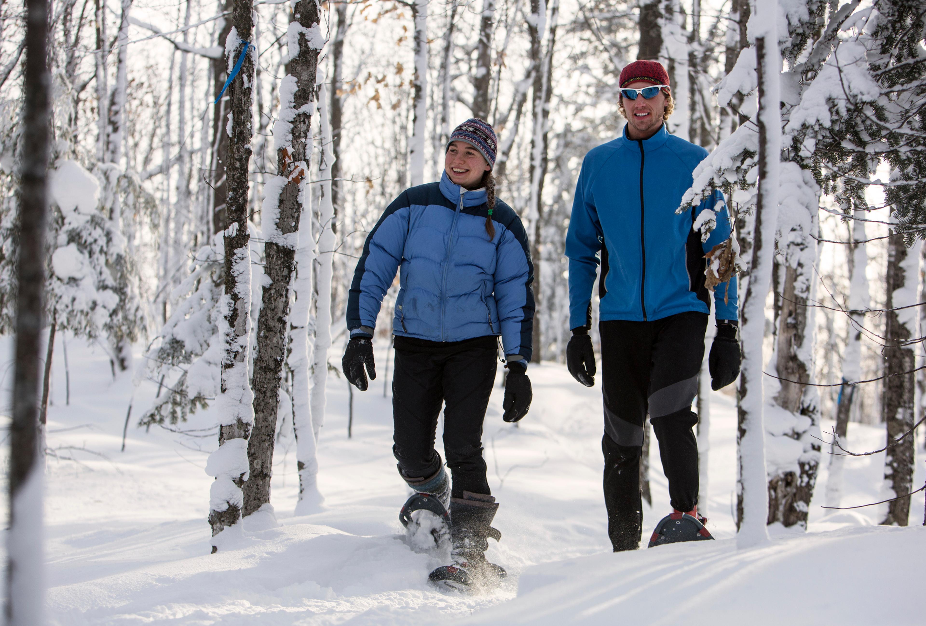 Snowshoeing: This activity requires wider strides than normal so you’re not stepping on the frame of the snowshoes. Ski poles are optional while snowshoeing, but they do tend to give you a better full-body workout since you’re getting your arms involved.