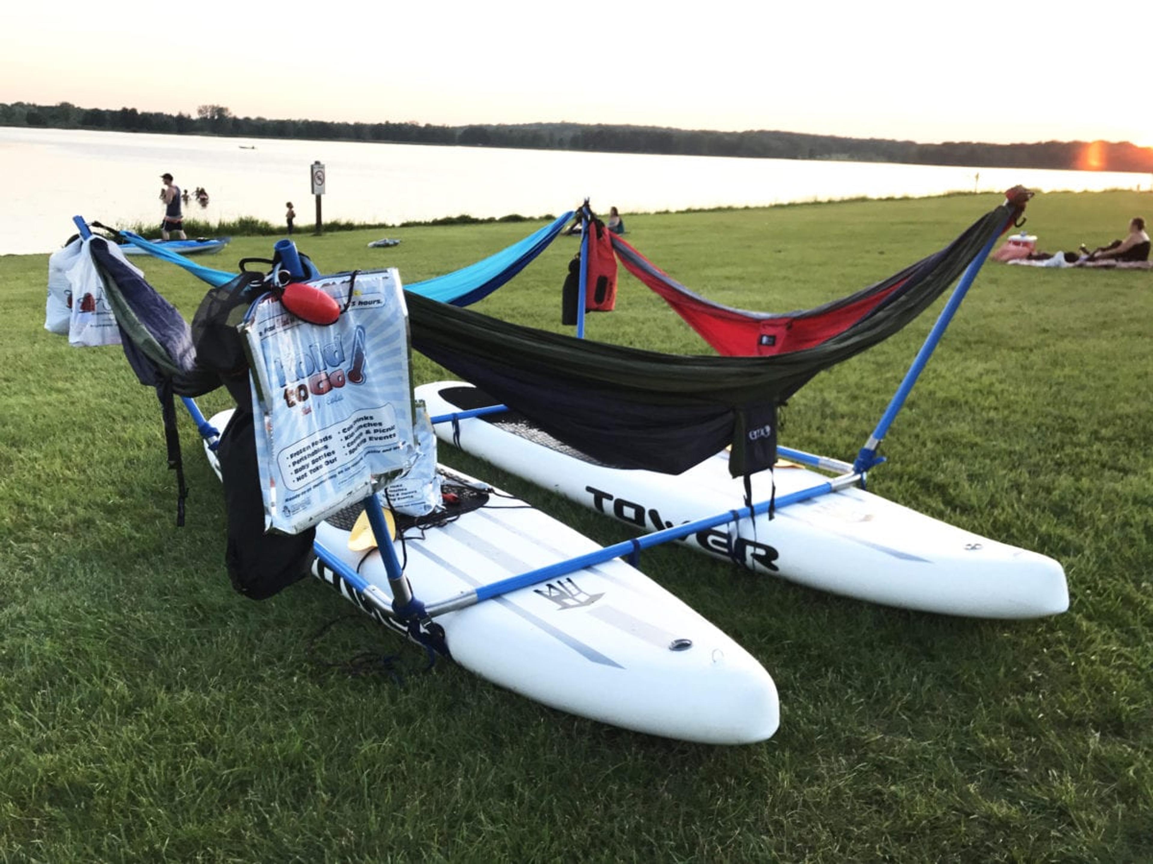 That’s right, it can be used with your favorite flotation devices! By tying the frame to two kayaks or paddleboards, you can take your lazy river adventure to a whole new level. Over water, you have to have at least two people hammocking, with one on each side for a balanced craft. You can make your craft mobile by paddling, or attaching small motors to the frame. Want to stay in one place? Tie the craft down or use a nine-pound anchor to help keep you stationary.