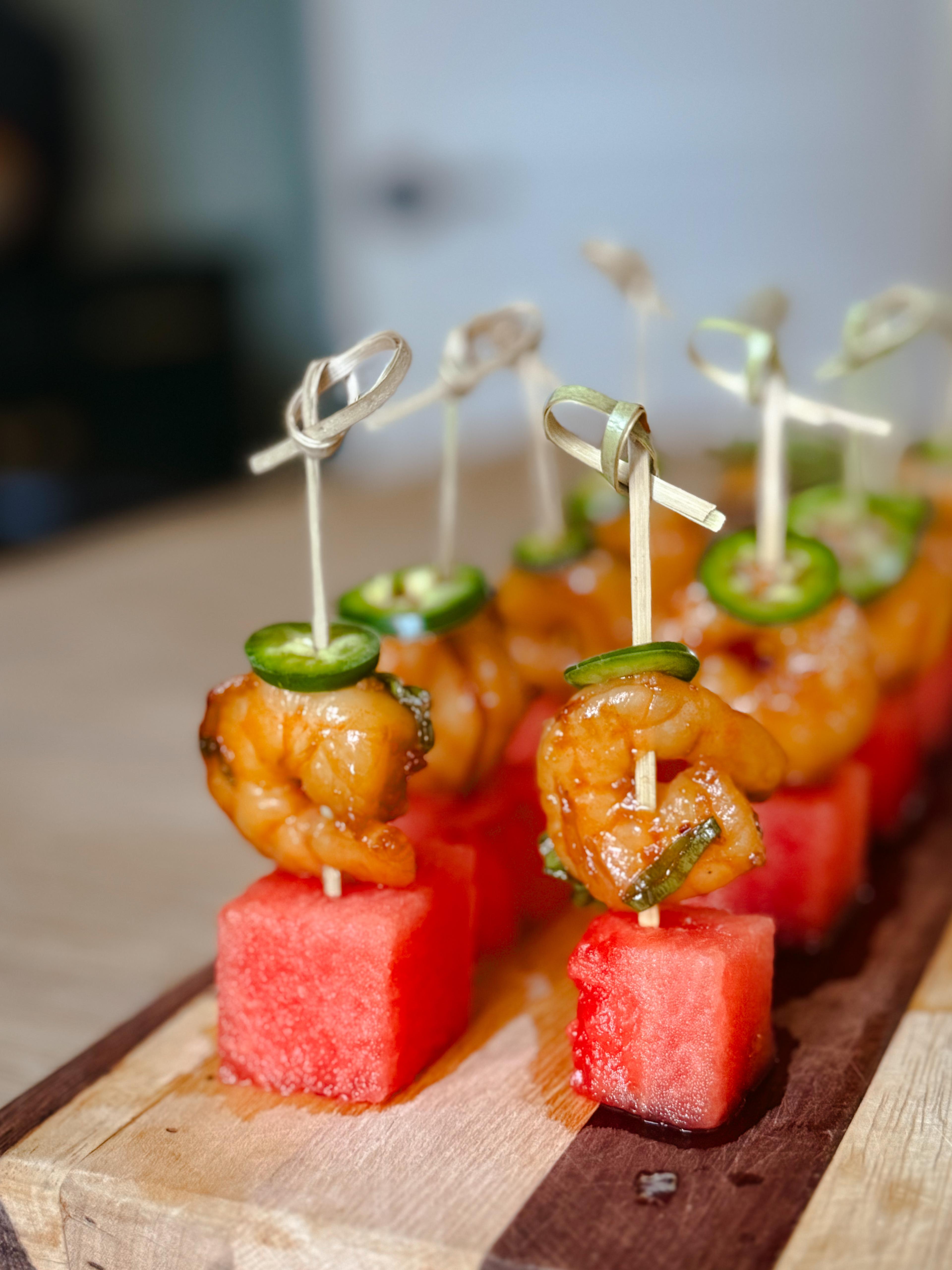 These refreshing shrimp bites combine a balance of sweet from the crisp watermelon and spicy from the jalapeño. Simply prepare a sauce, marinate the shrimp and cook for a short time before assembly.