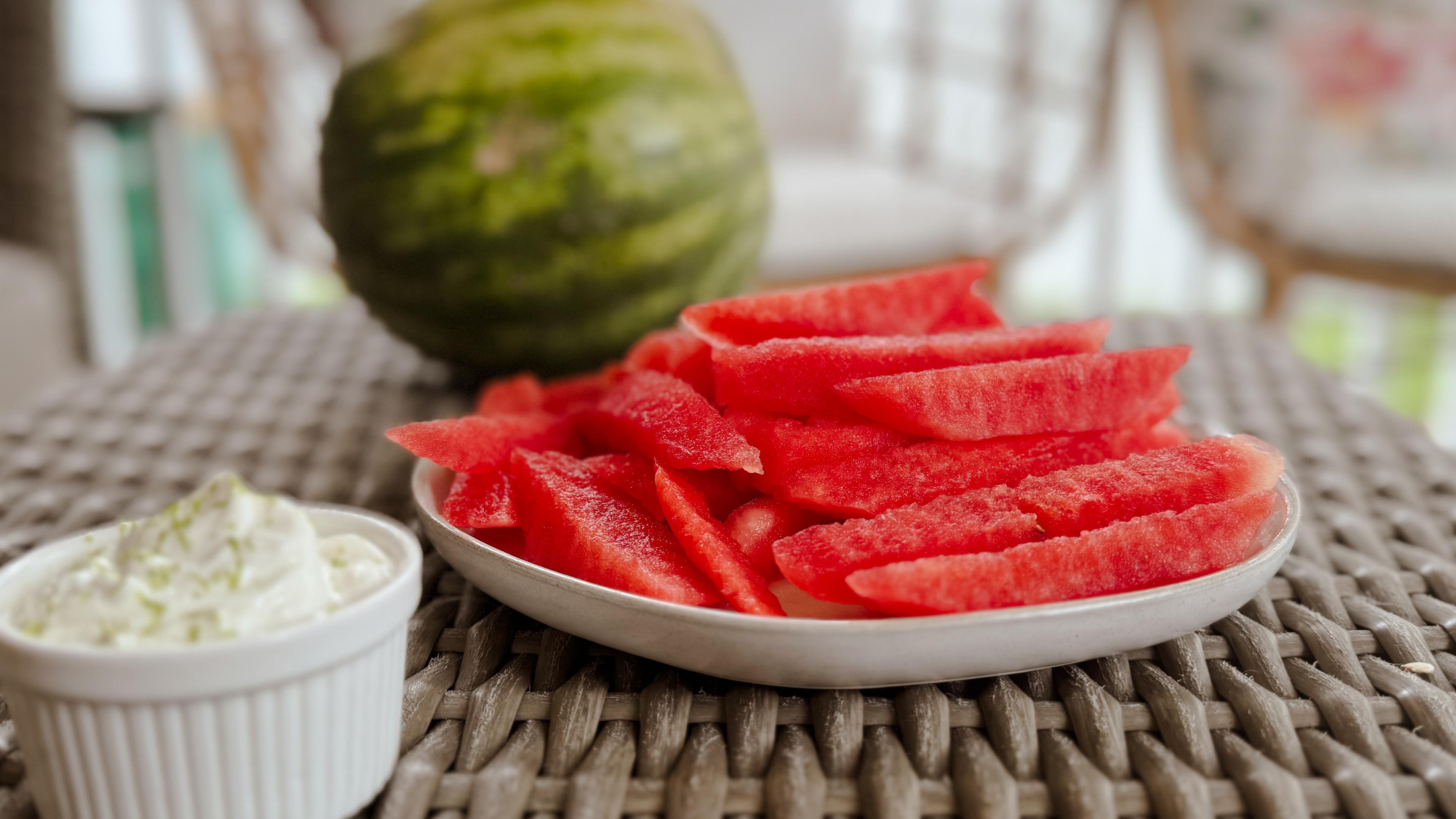 Watermelon tastes great on a hot day - it’s crunchy and thirst-quenching. These watermelon fries are served with a lime protein-packed yogurt sauce.