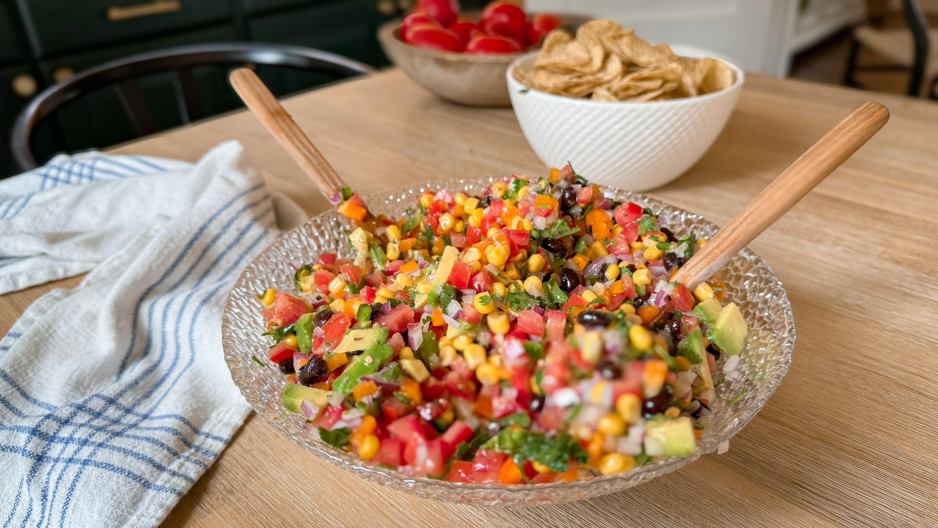 This corn salsa is packed in veggies like creamy avocado and colorful Roma tomatoes and bell peppers. Easy to make, this recipe comes together in under 15 minutes. Simply add all ingredients to a bowl, toss with an Italian vinaigrette and get to dipping.
