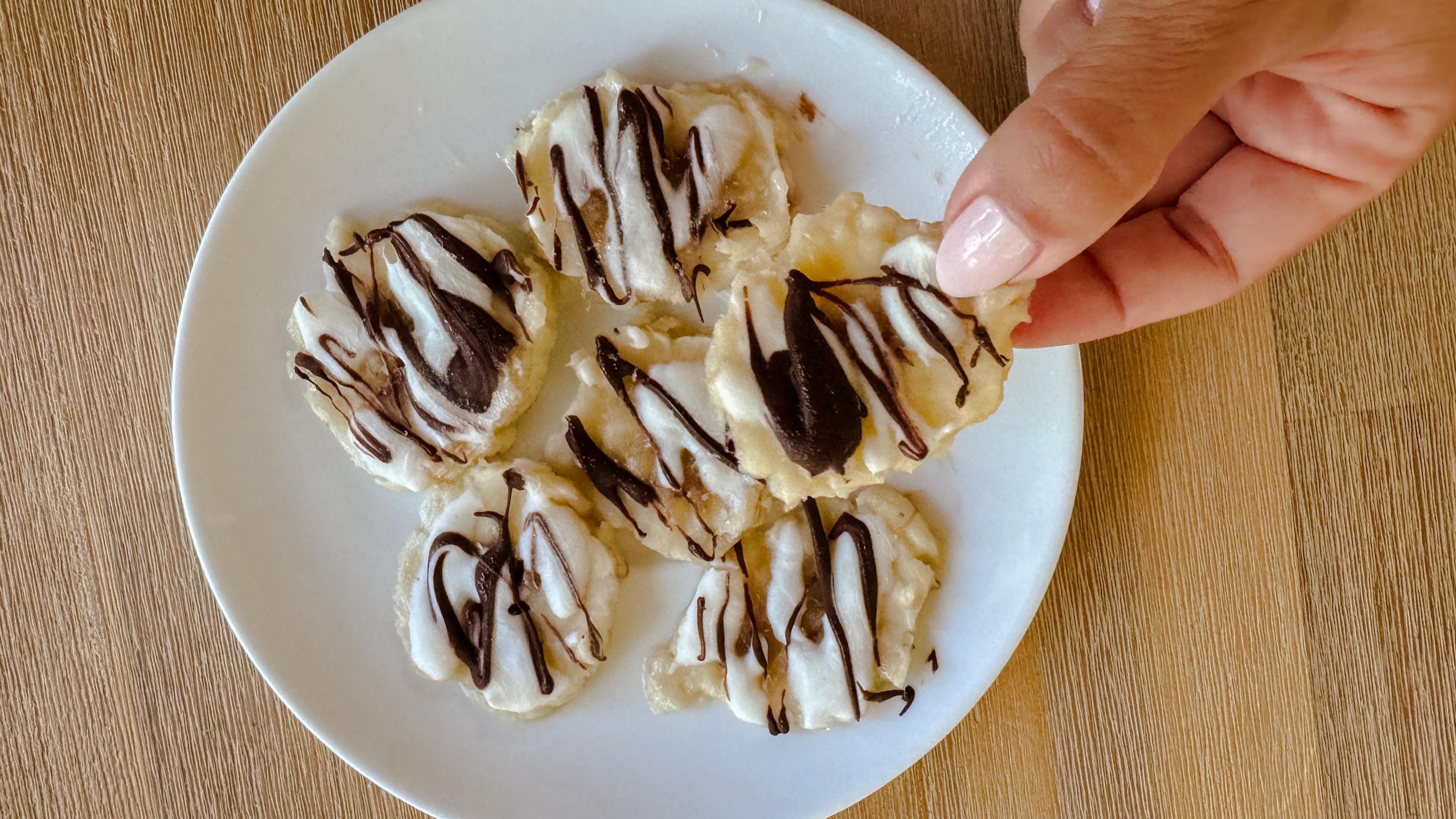Drizzle yogurt and melted chocolate over the banana bites and freeze for 3-4 hours until solid. Enjoy as a snack or dessert.