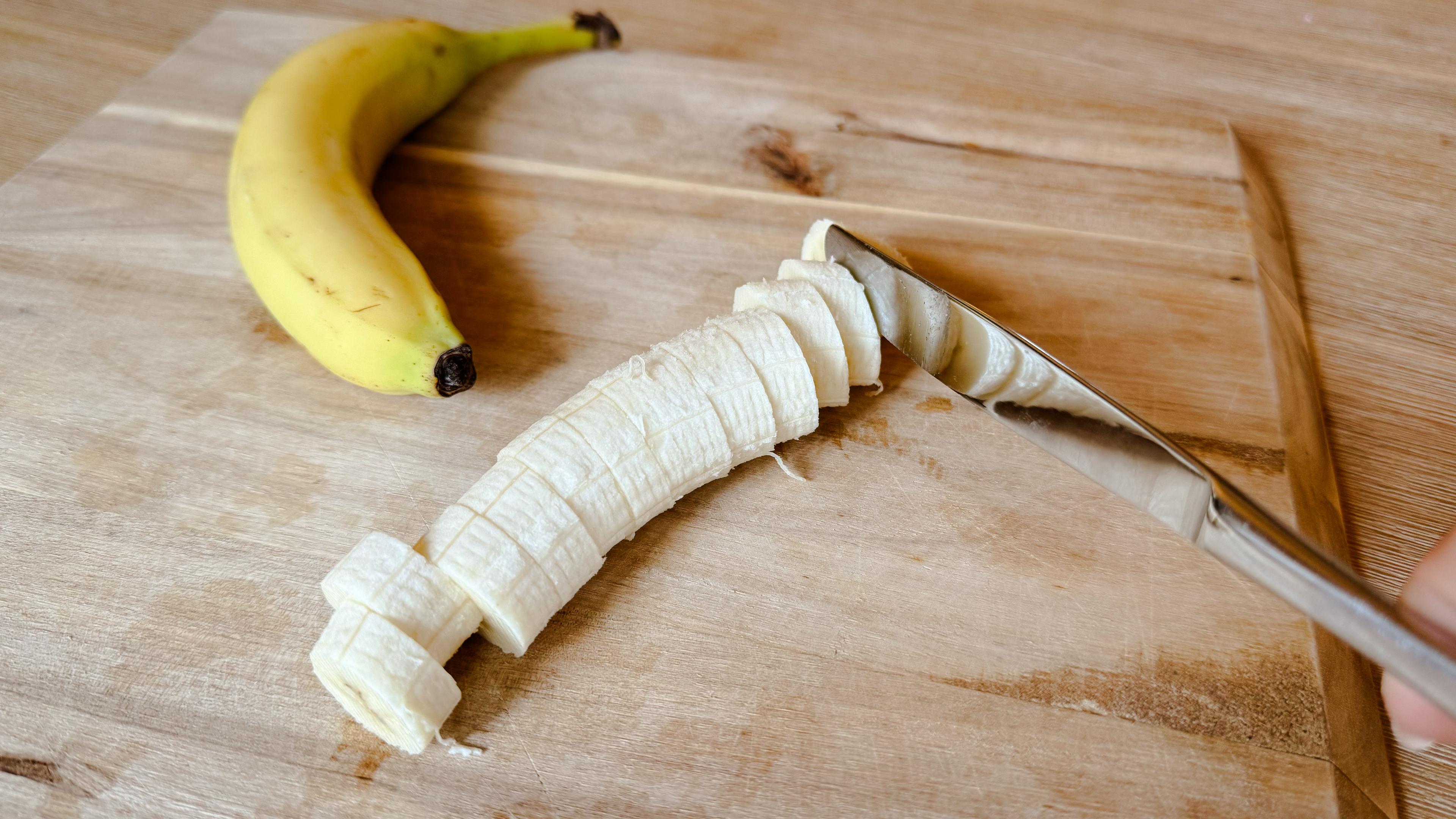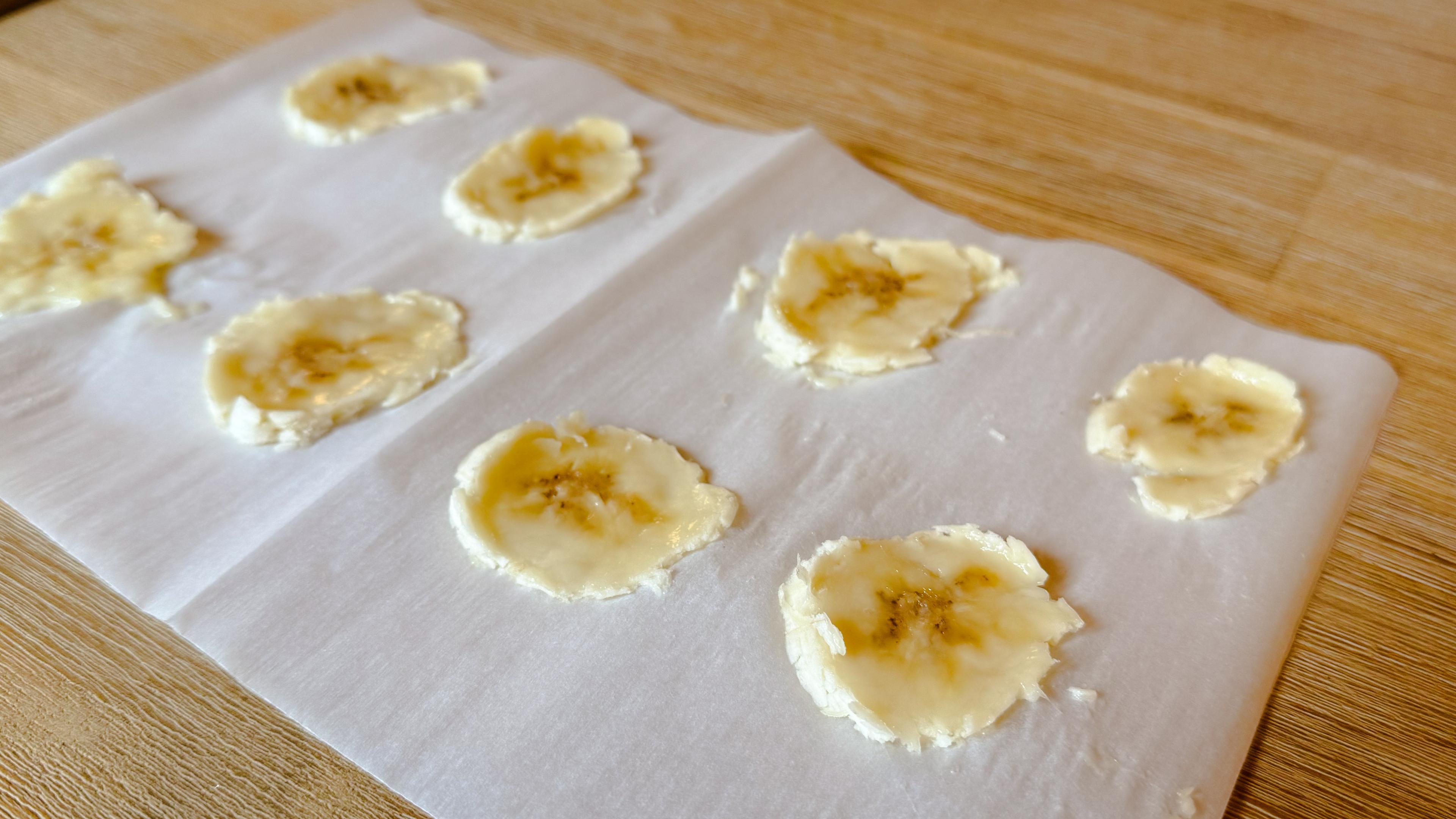 Place banana slices a couple of inches apart on parchment paper. Using a glass, press down on the slices to expand into larger, thinner bites.