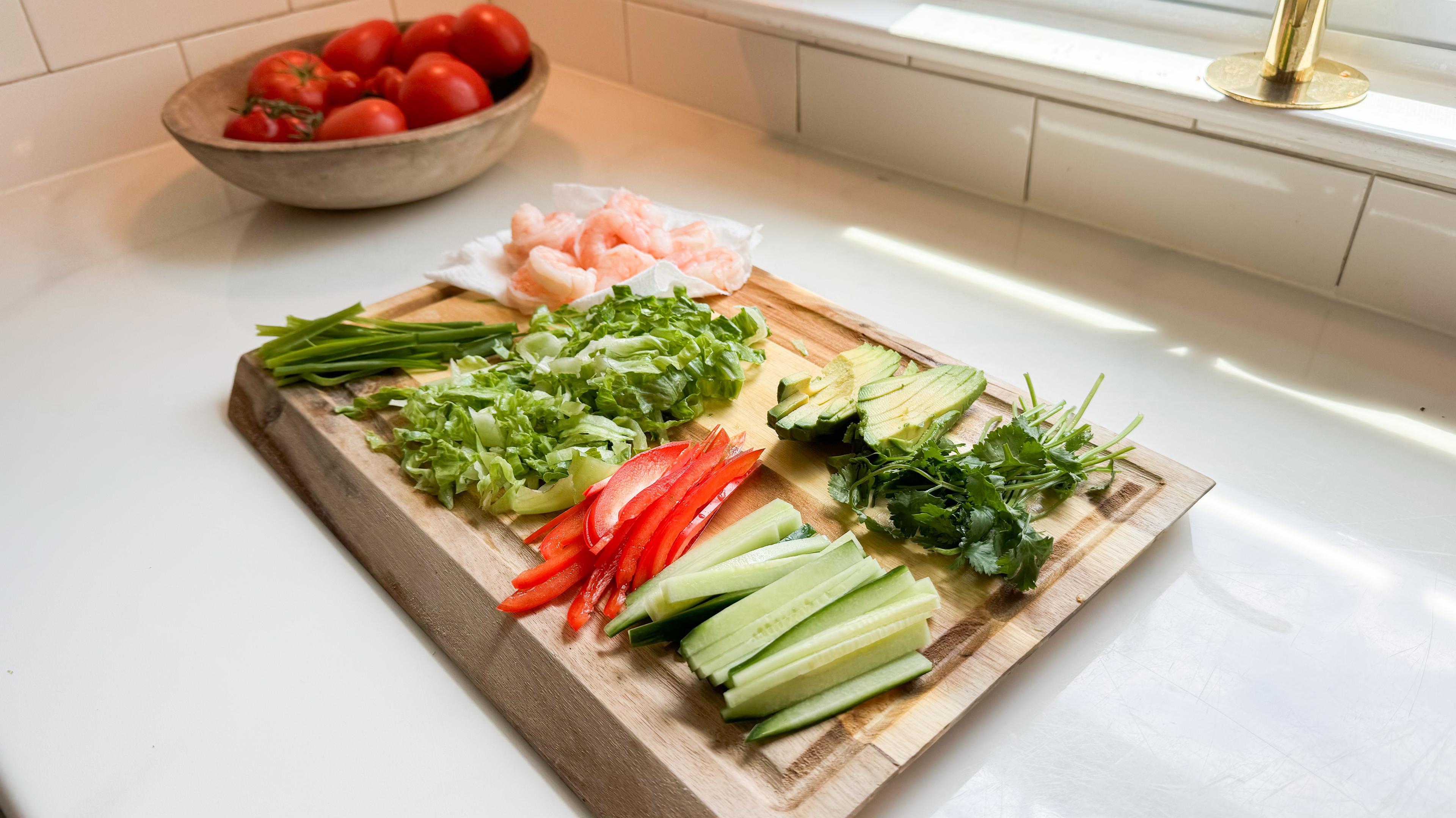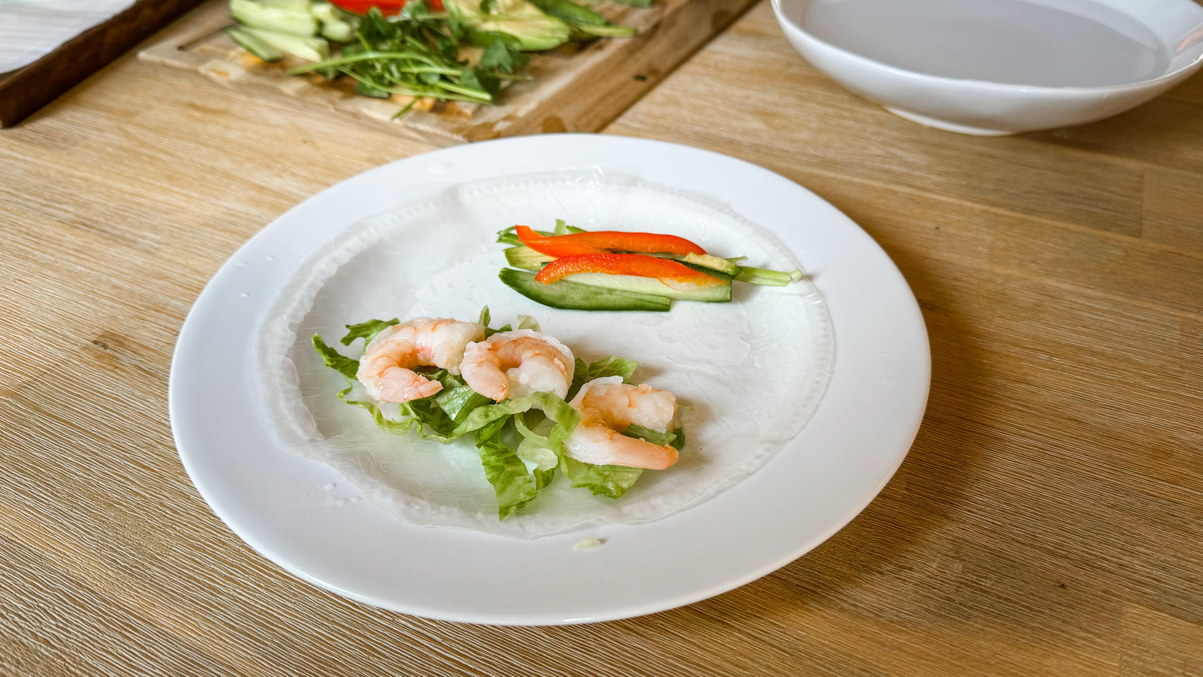 Apply ingredients (3 shrimp, a little lettuce, bell pepper strips, cucumber strips, cilantro, green onion and avocado) on two opposite sides of the rice paper, folding at the top over the first bunch of ingredients, then fold in on both sides and continue rolling.
