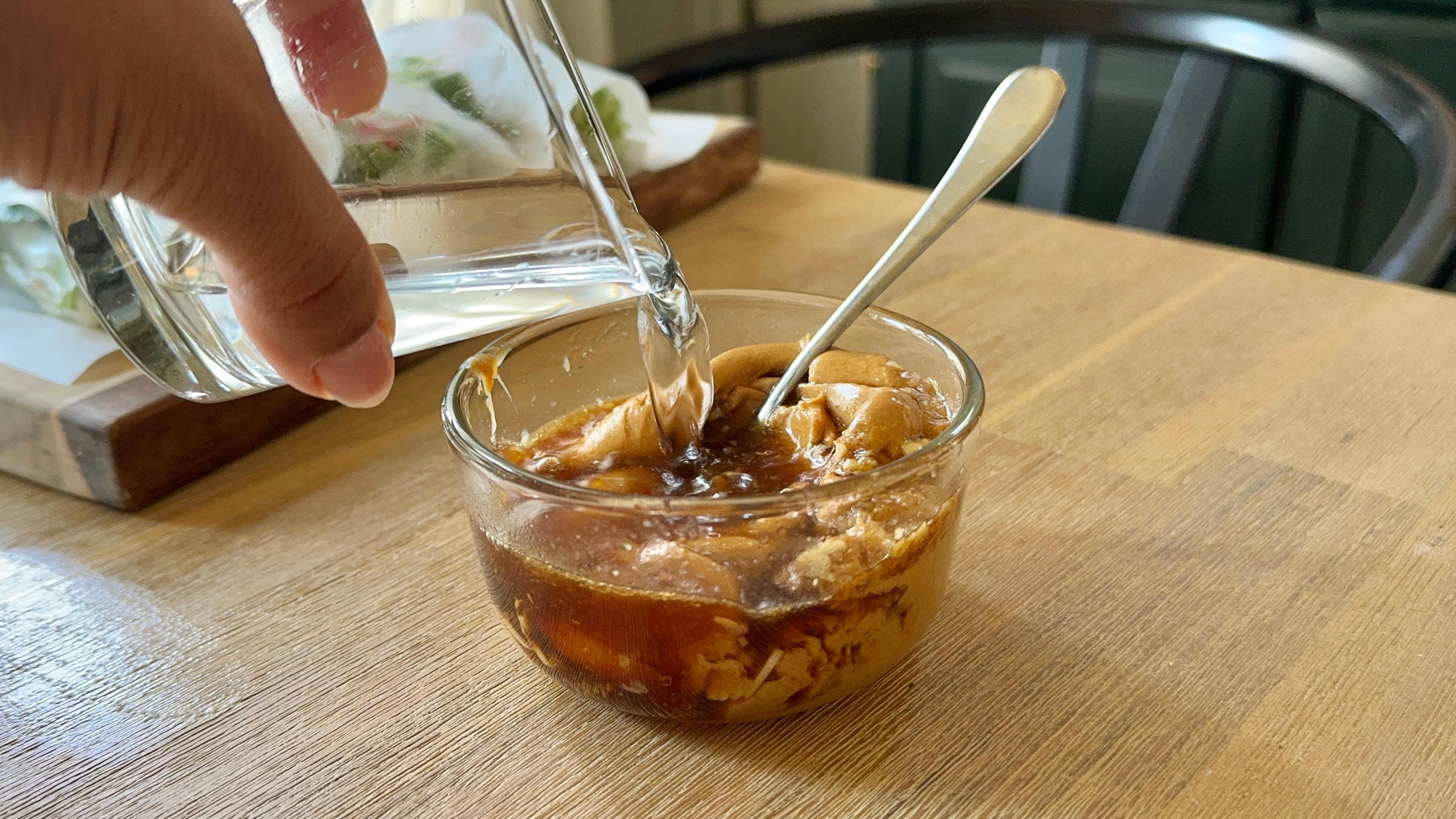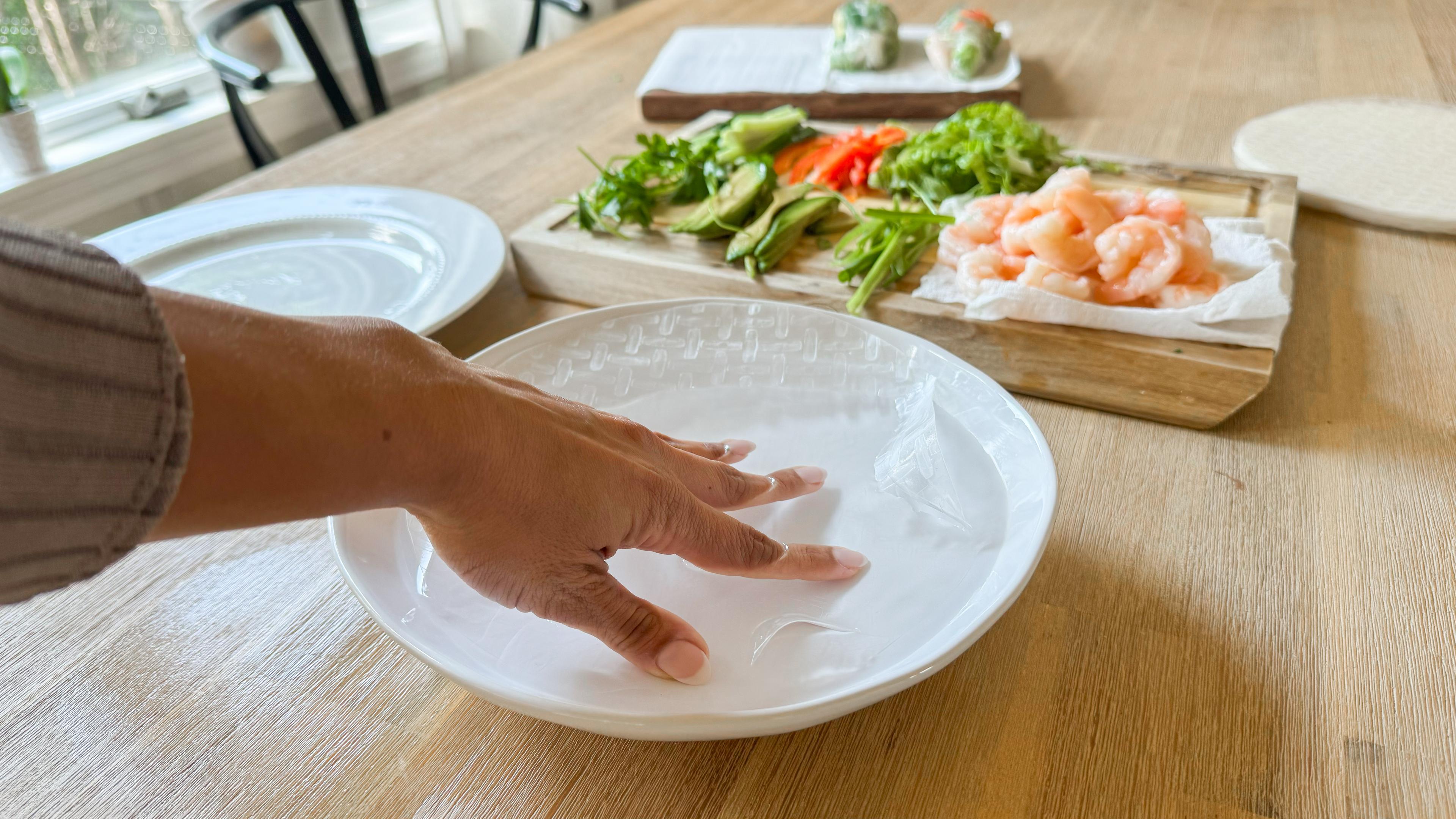 Soak rice paper in warm water for 5-10 seconds. Soaking it for too short of time will make the paper crack while soaking it for too long will make the paper mushy and break.