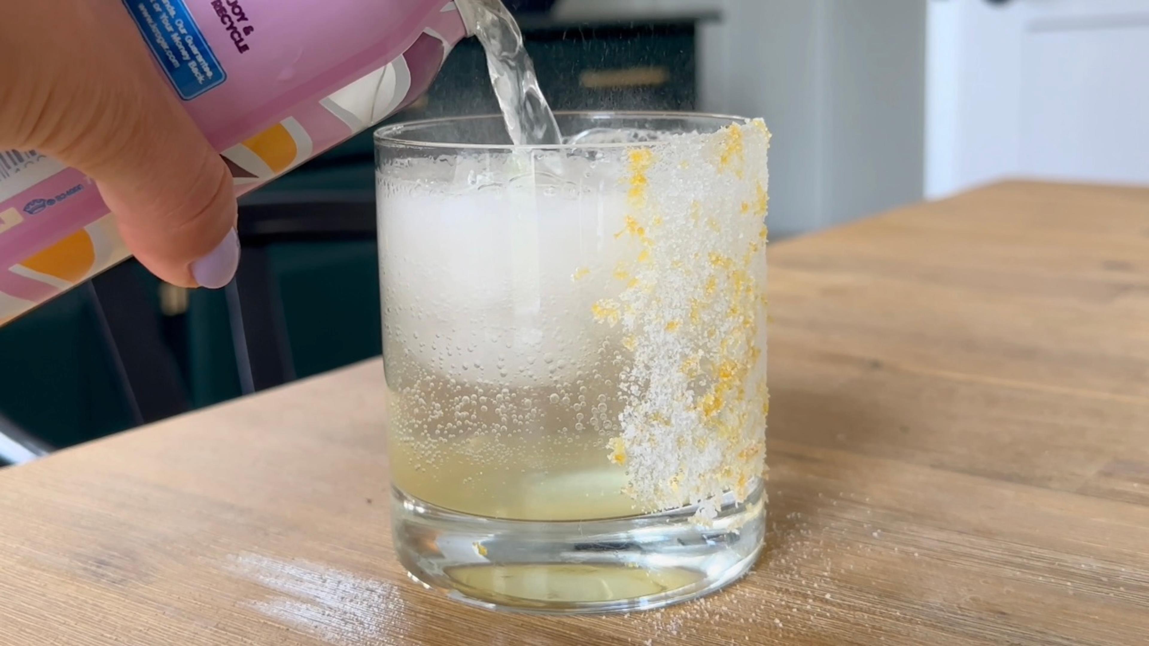 In the same glass, add lemon juice and honey. Stir until well-combined. Add ice, then add sparkling water, leaving room for a splash of ginger beer. Stir and serve. Enjoy!
