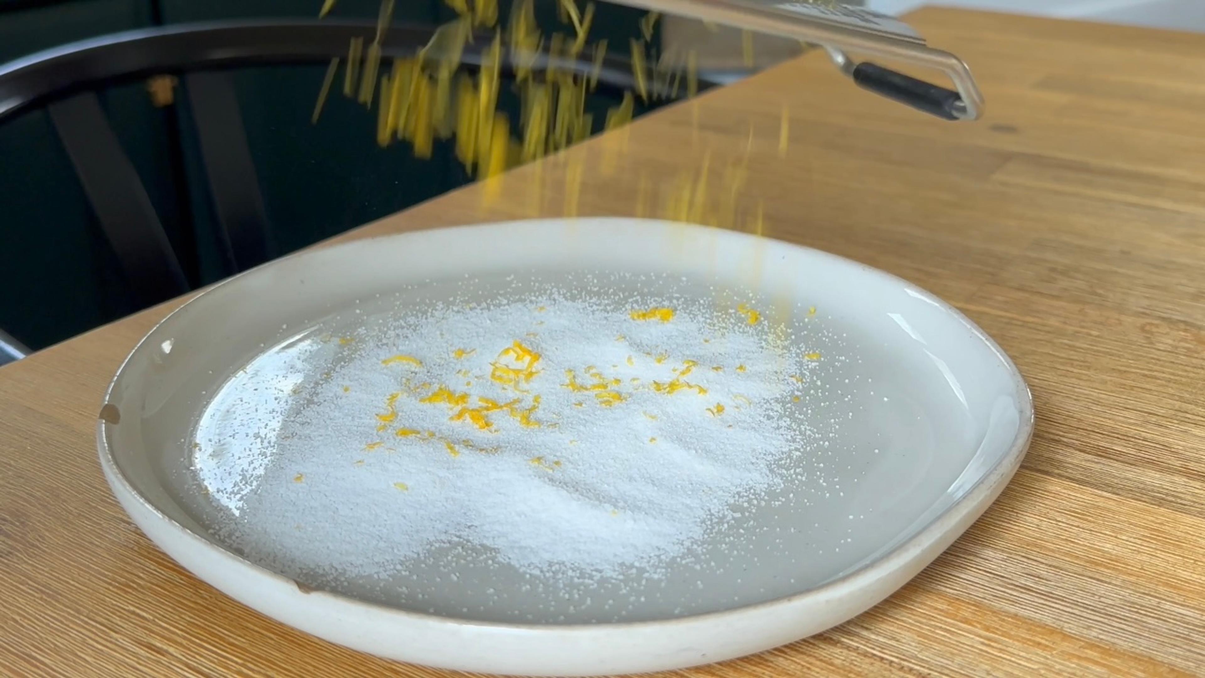 For the garnish - on a plate, add sugar and zest from 1 lemon.