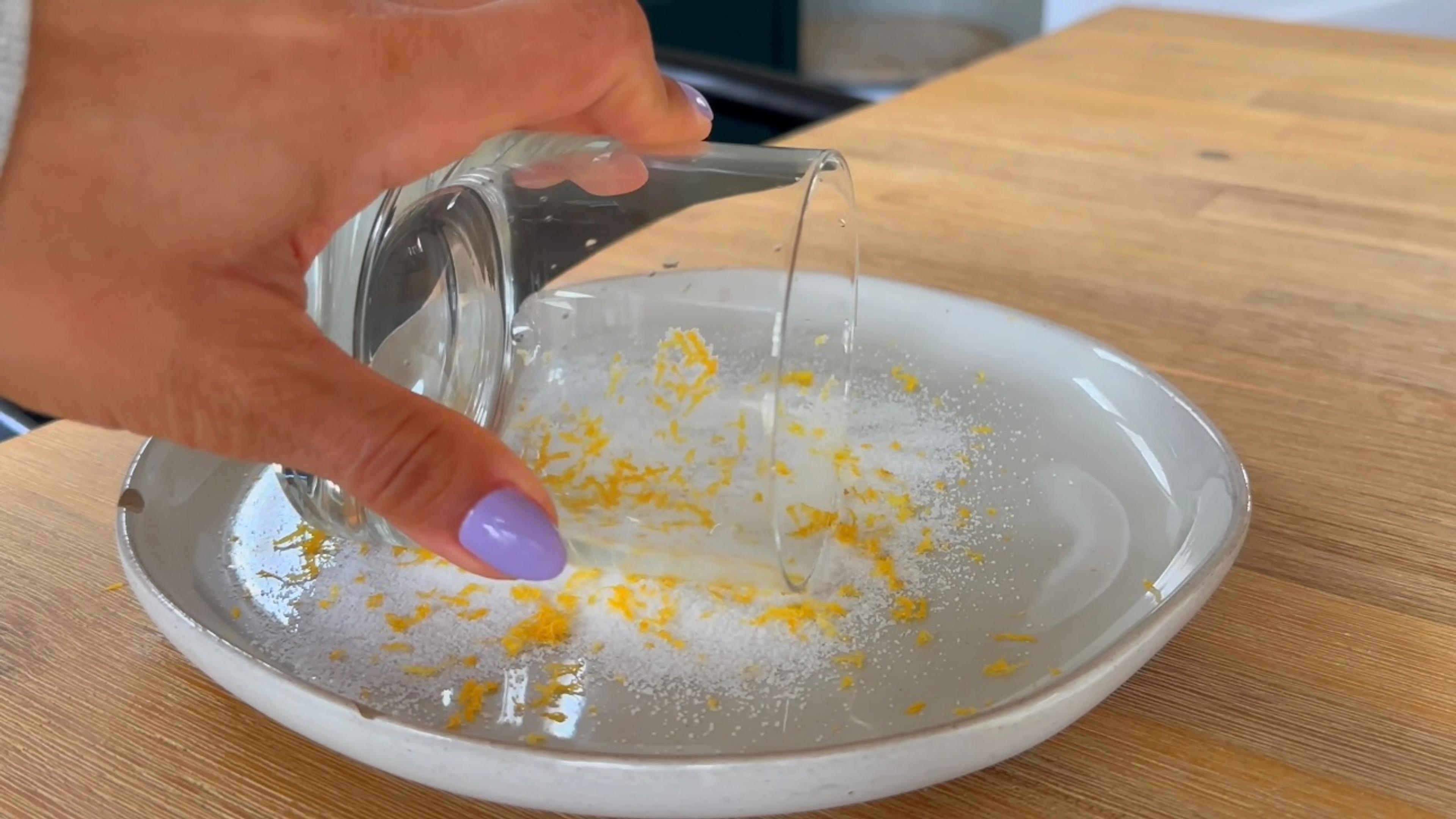 Halve a lemon, rub the edge of it against the side of a glass, then roll on the sugar and zest plate.