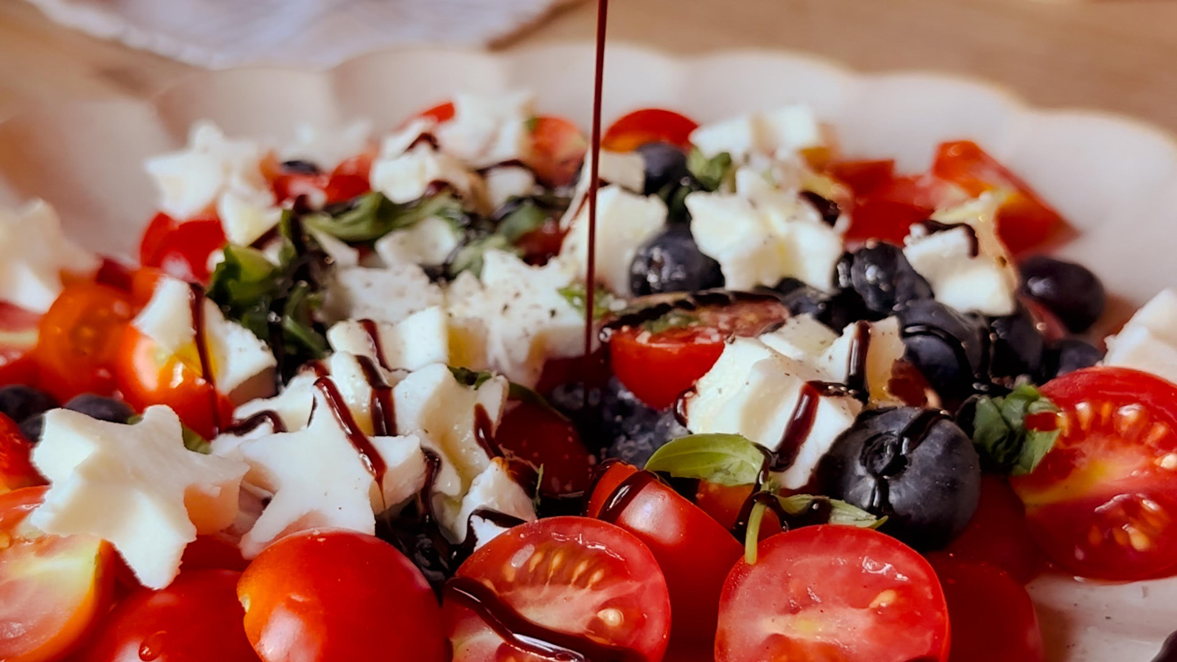 The red, white and blue salad provides a fresh and light option, showcasing seasonal produce with the sweetness of blueberries complementing the savory mozzarella and tangy balsamic glaze.