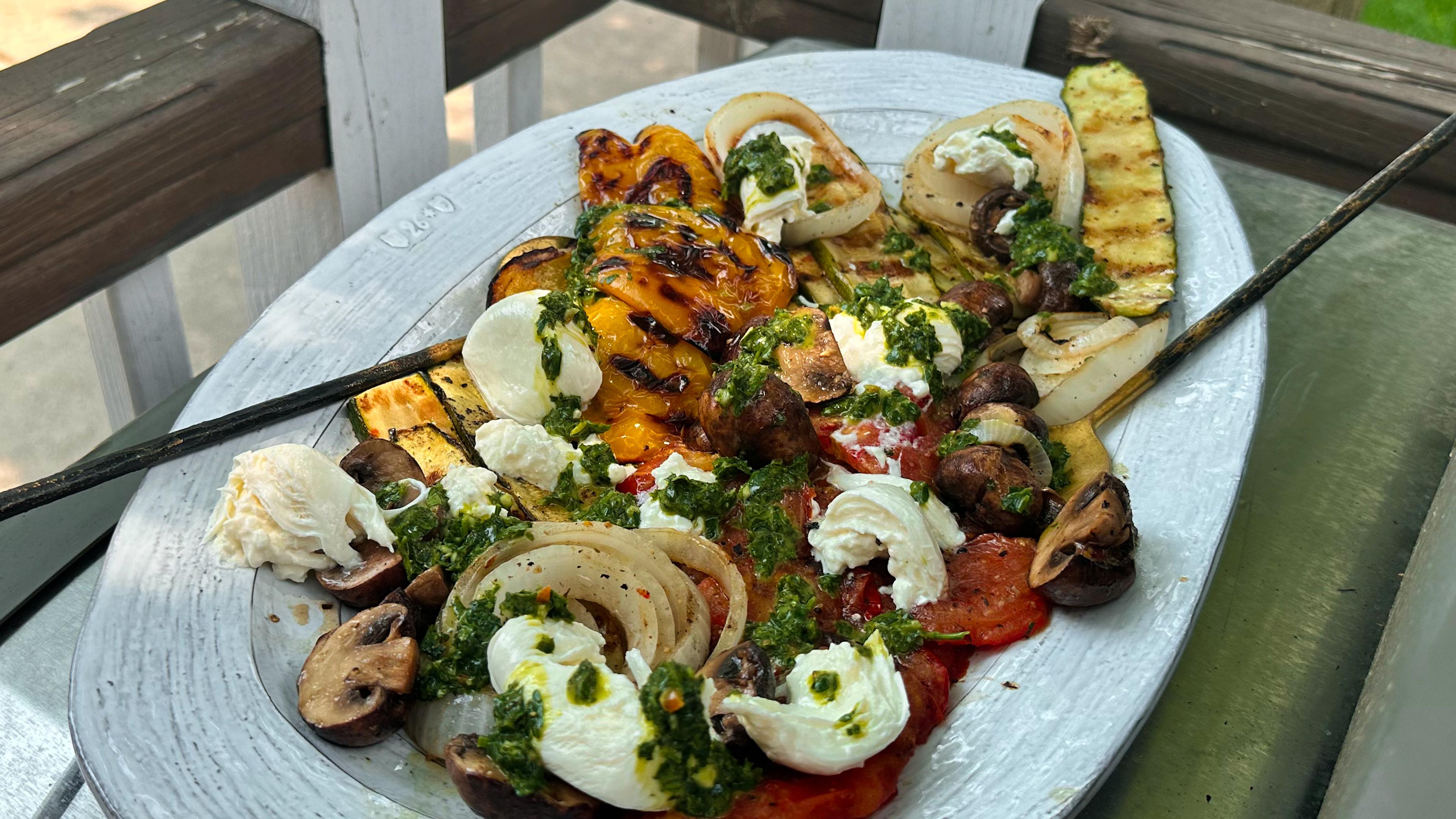 Once grill marks appear and desired texture is achieved, remove vegetables and place on a serving plate. Top with a drizzle of chimichurri and torn burrata.