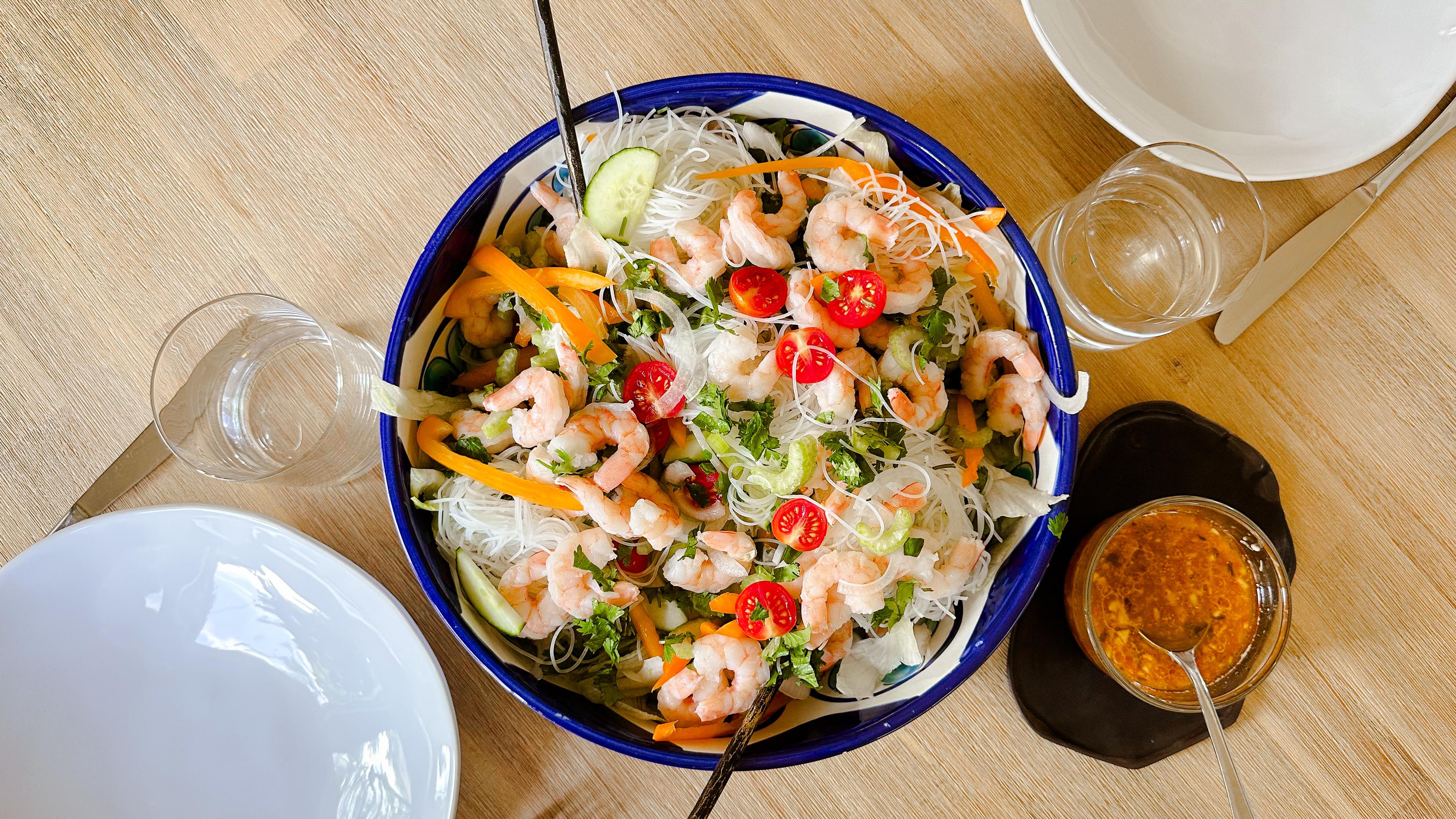 In a large bowl, add veggies, cilantro and shrimp. Trim the rice noodles then swirl into the salad.