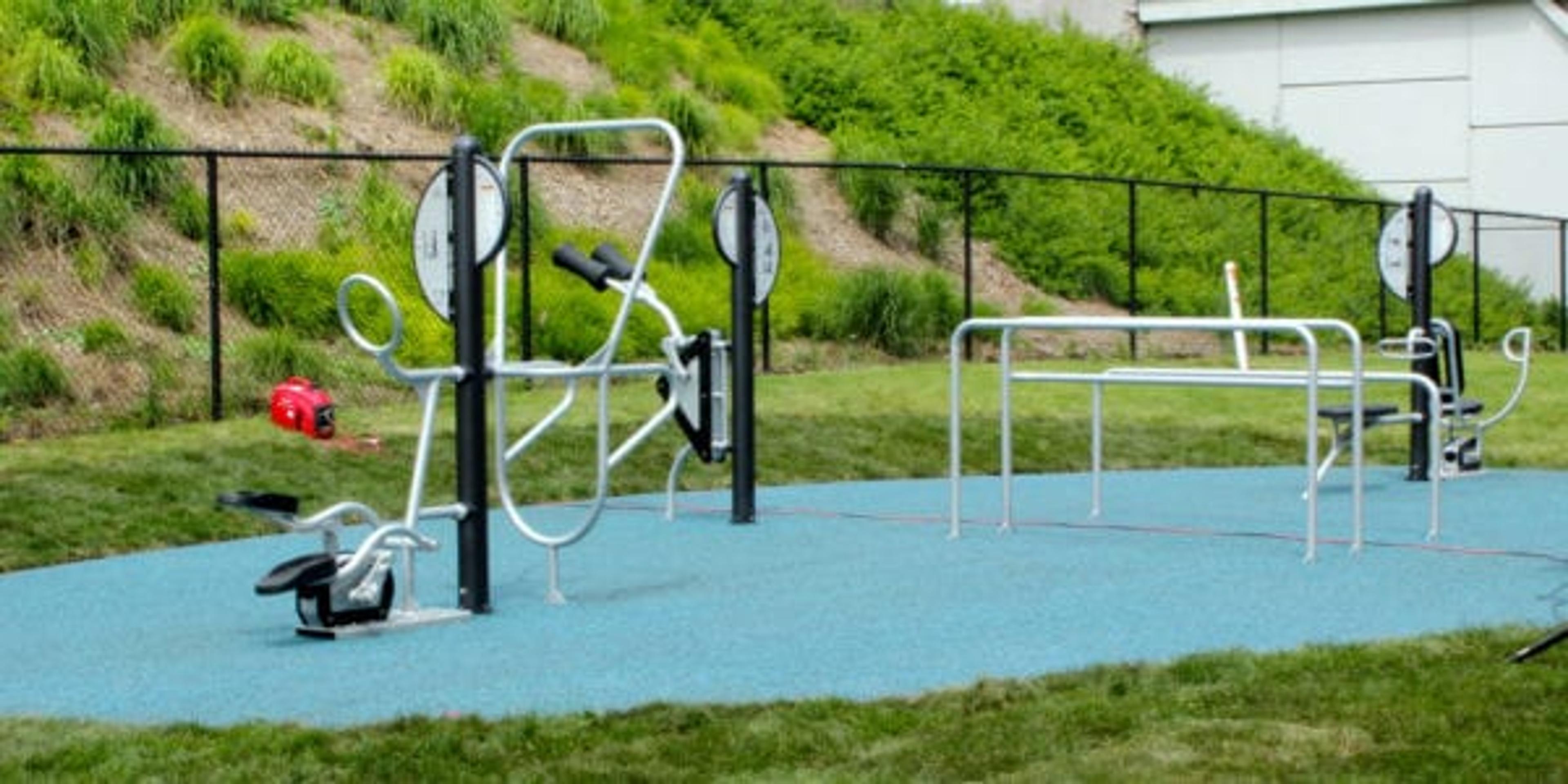 The Fit Park features a new HealthBeat Outdoor Fitness System for ages 13 and up that includes parallel bars, pull-up bars, ab crunch/leg lift, cardio stepper, squat press and chest/back press.