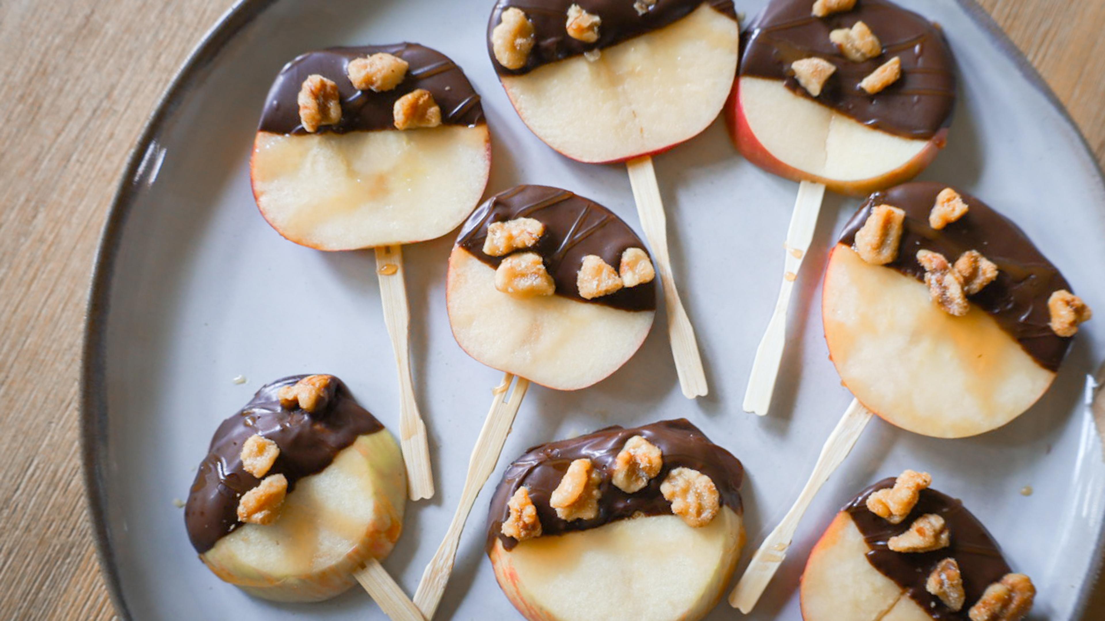 This recipe reimagines indulgent caramel apples as a lighter, more wholesome option. Apple slices are lightly dipped in a dark chocolate, then drizzled with a light coat of caramel and topped with walnuts. These skewered treats offer the classic caramel apple flavor with fewer calories and less sugar.