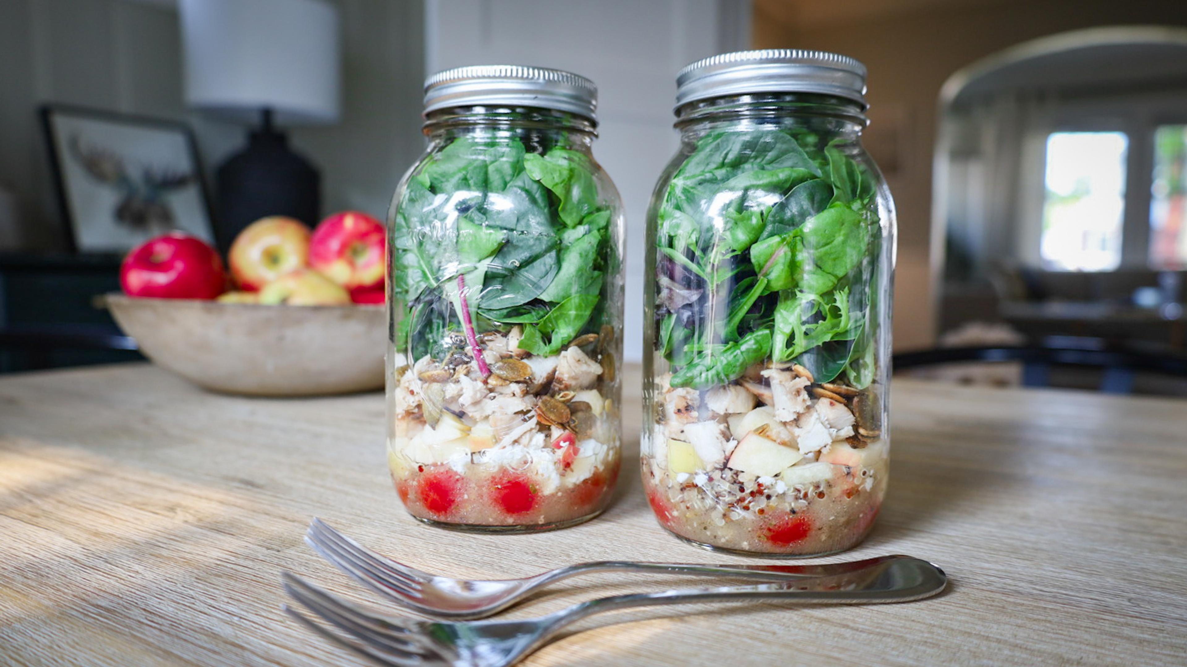 This salad in a jar recipe showcases fall flavors from Honeycrisp apples and pumpkin seeds. The layered nature of the salad ensures freshness and makes it perfect for meal prep. Enjoy this seasonal salad as a nutritious lunch on-the-go or a light, easy dinner.