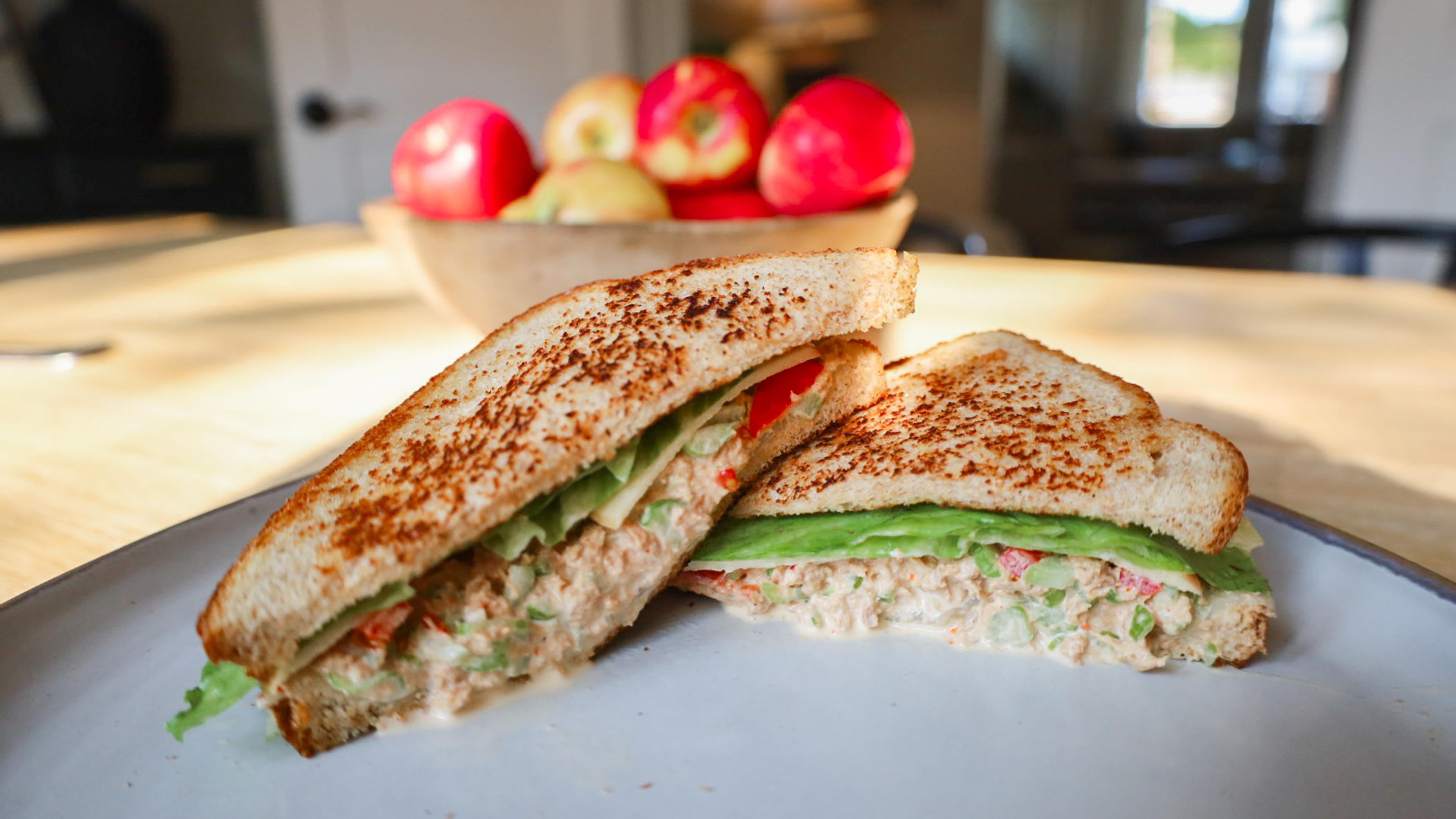In this twist on a familiar favorite, Honeycrisp apples and celery add sweetness and crunch to a sweet and spicy tuna melt. Whole wheat bread provides a hearty and fiber-rich base for melty Swiss cheese, juicy Campari tomatoes and crisp iceberg lettuce. Simply toast the bread, flip, add the cheese to allow it to melt and top with the rest of the ingredients.