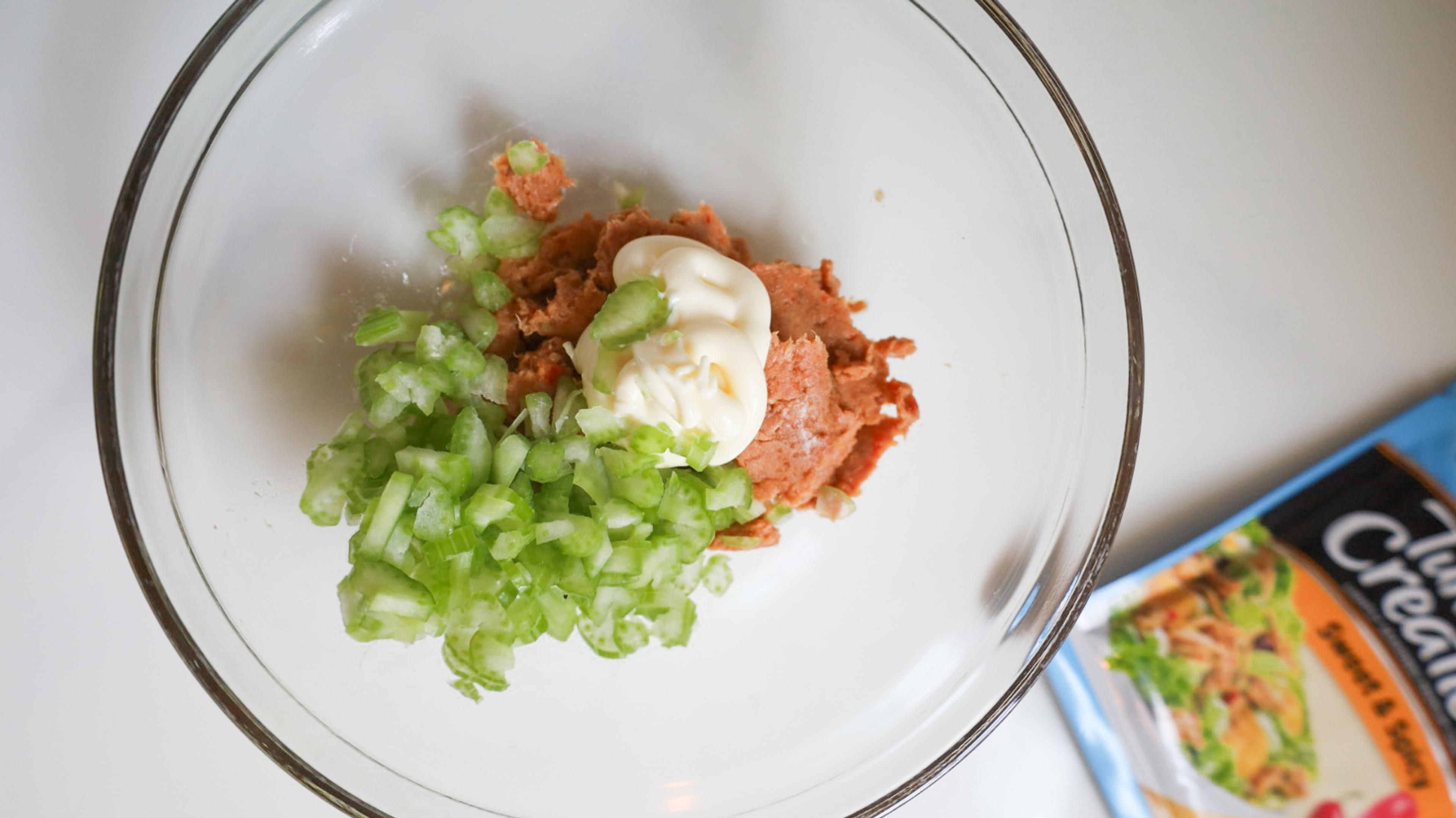 In a mixing bowl, add spicy tuna package, light mayonnaise and celery. Mix until well combined.