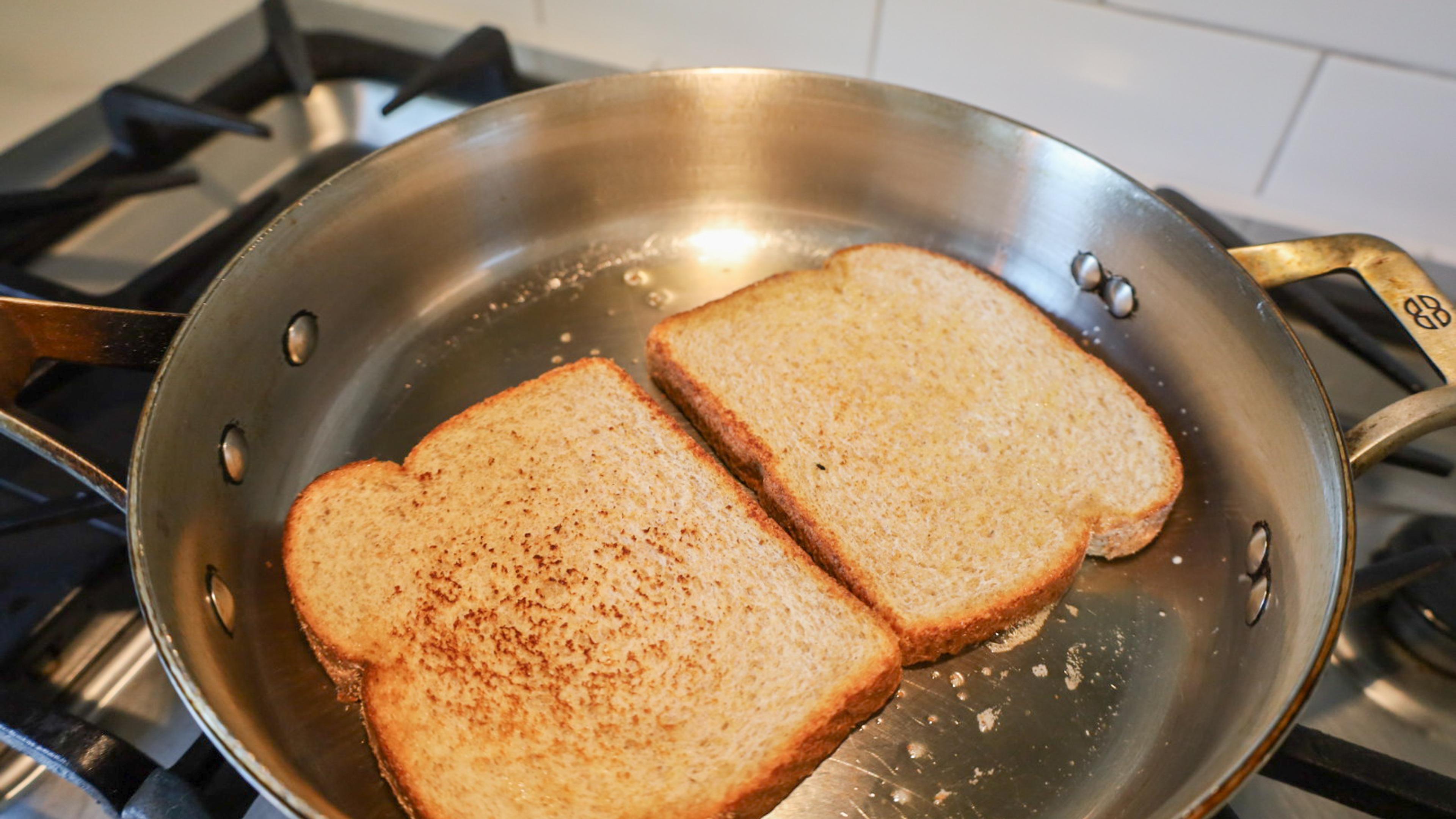 Heat a large pan to medium. Add spray oil. Once hot, add bread slices.