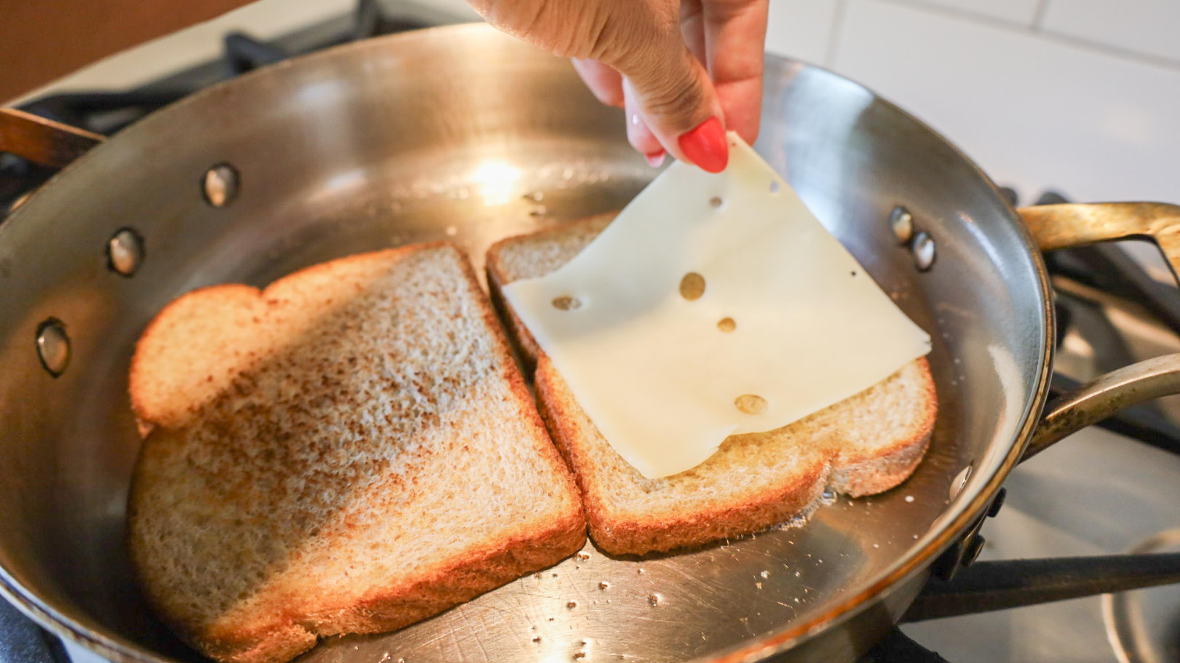 Once one side of the bread is golden, flip then add cheese to two of the slices to allow it to melt.
