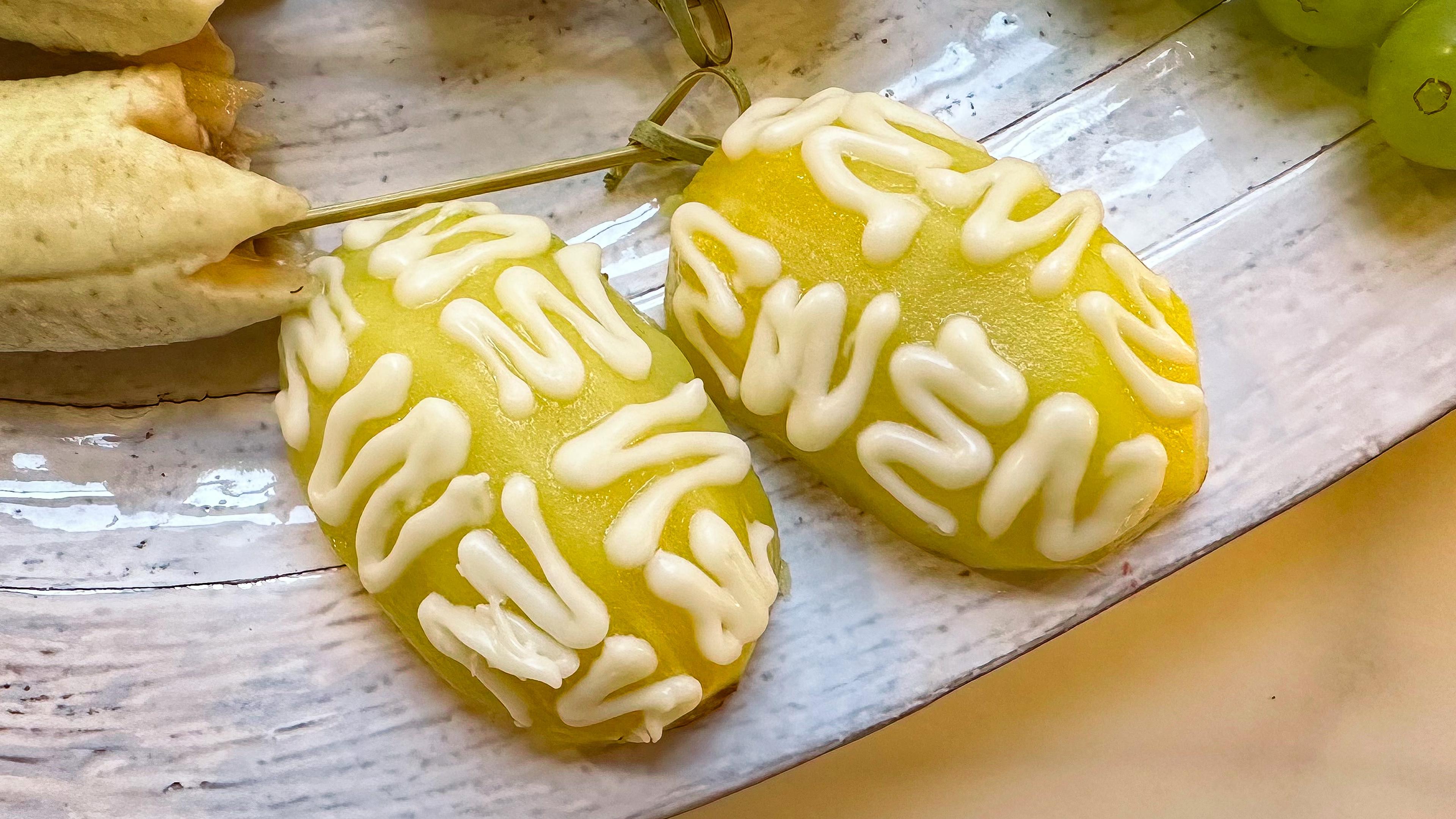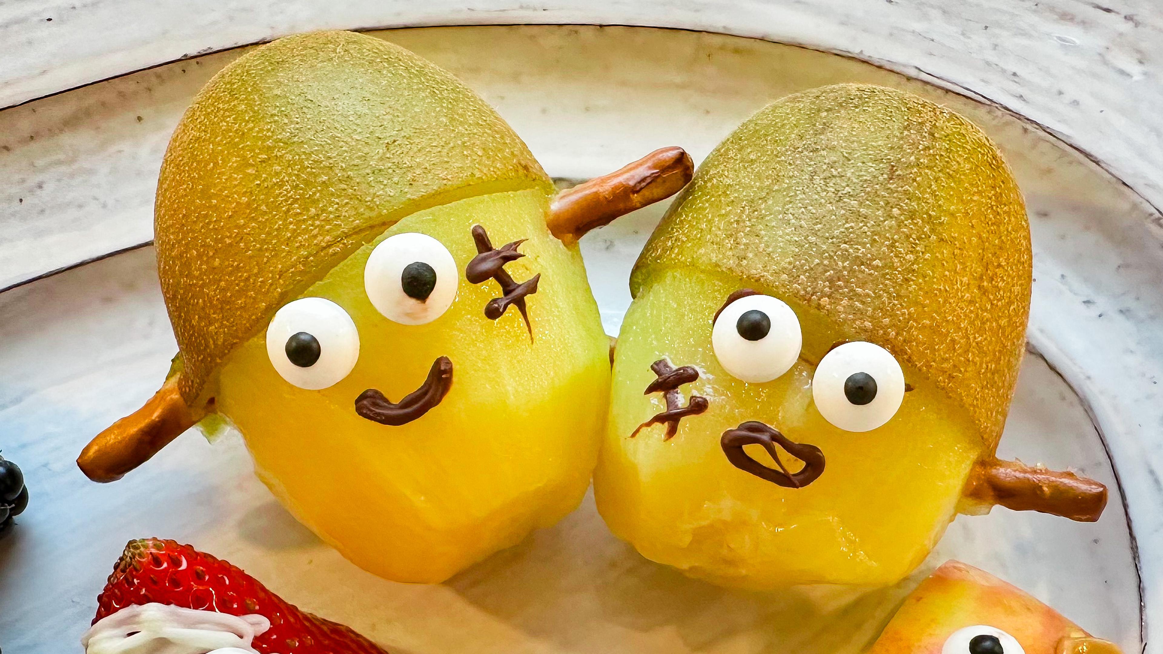 Peel and halve kiwis. Melt white chocolate and using a zip bag with a small corner snipped, pipe a brain pattern on top.