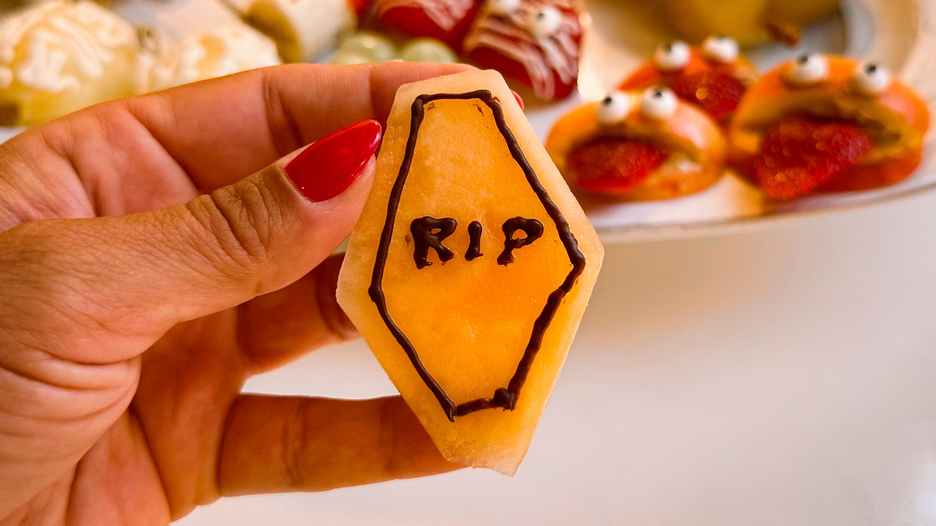 Simply half, core and slice the cantaloupe about 1/4 -inch thick. Cut the slices into coffin shapes. Pipe the edge of the coffin shapes with chocolate and write RIP on the front if desired.