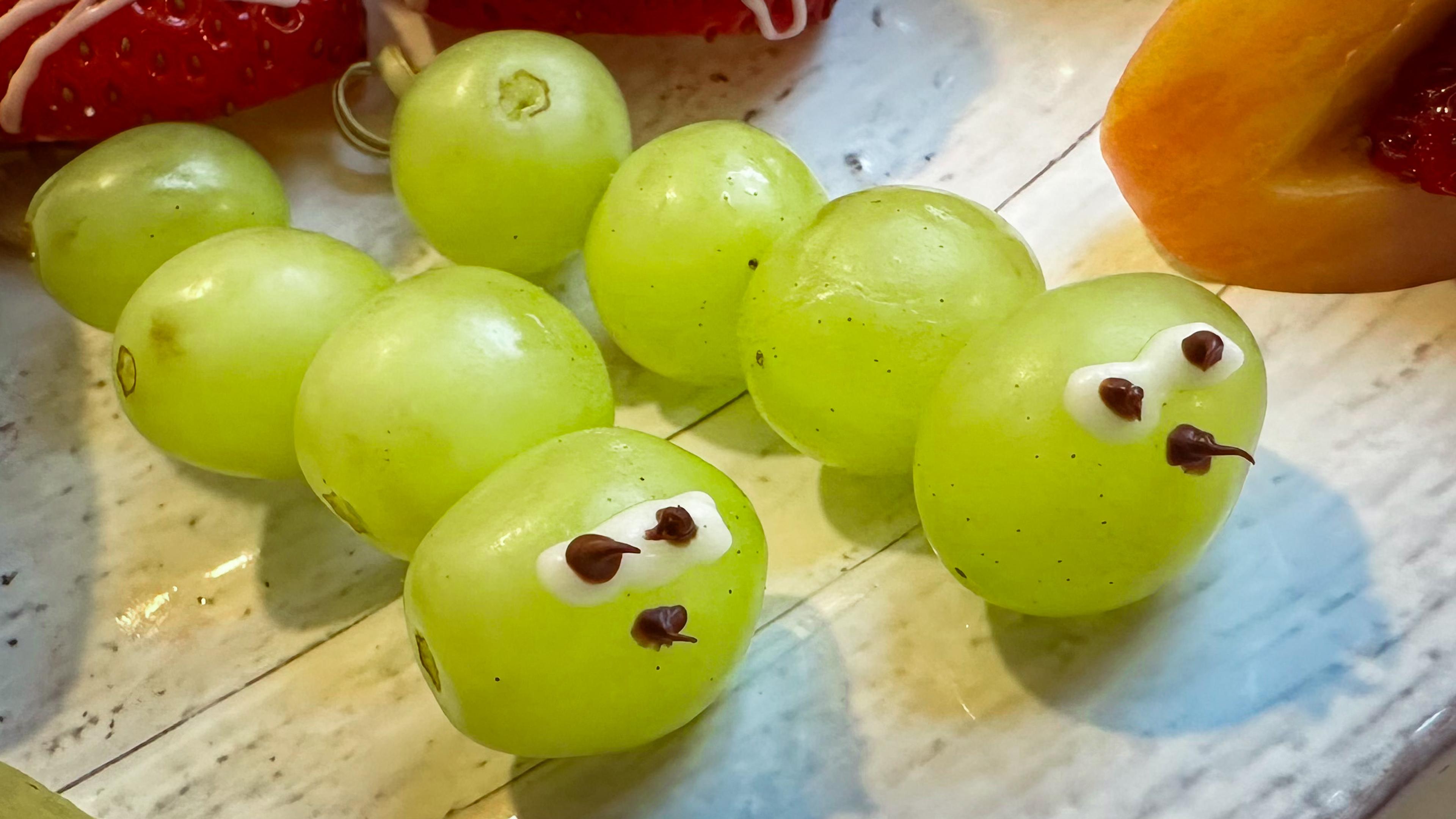 Line green grapes on a skewer or long toothpick. Make eyes by piping chocolate. If desired, pipe chocolate along the bottom side of the grapes to mimic legs.