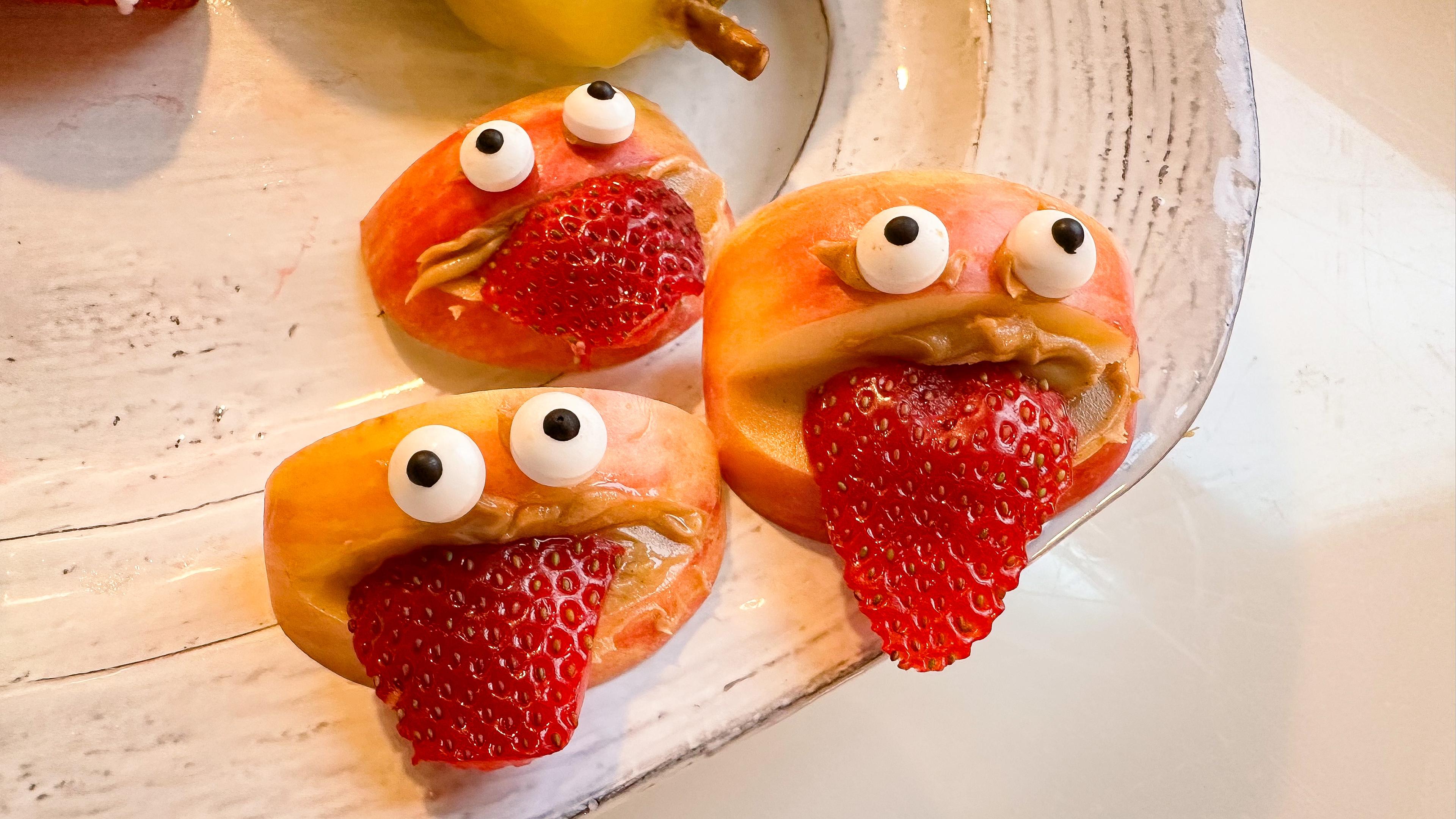 Cut the sides off an apple, leaving the core squared. On the peel side, cut a slit into the apple slices. Stuff the slit with peanut butter. Place a strawberry slice as a tongue. Use peanut butter as glue and place edible eyes.