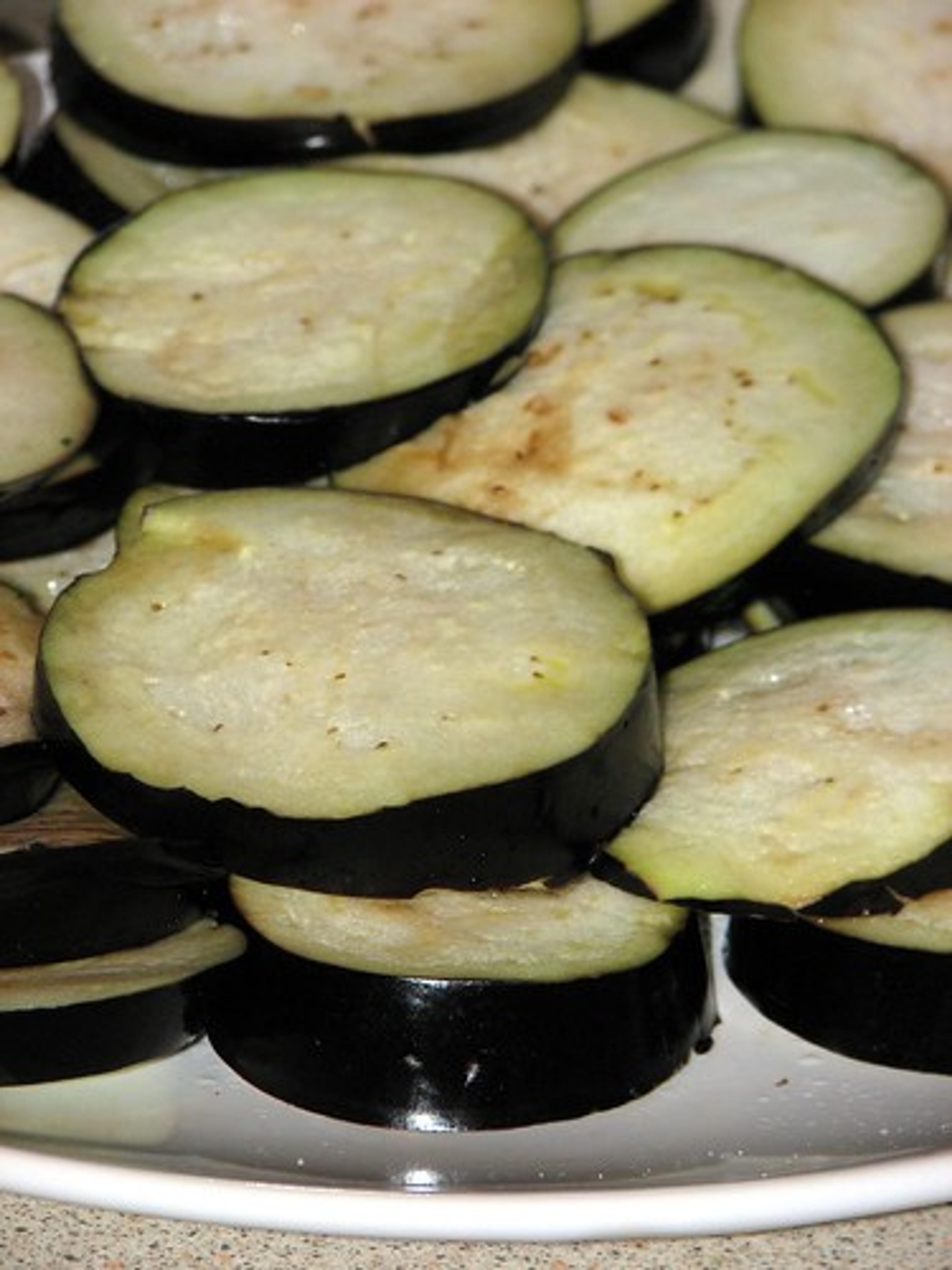 Thinly slice the eggplant into rounds and season with salt. Pour some flour into a shallow dish. Beat the eggs in another dish. In a third dish, mix the breadcrumbs and parmesan. Dredge the eggplant in the flour, then dip in the eggs and coat with the breadcrumb mixture.