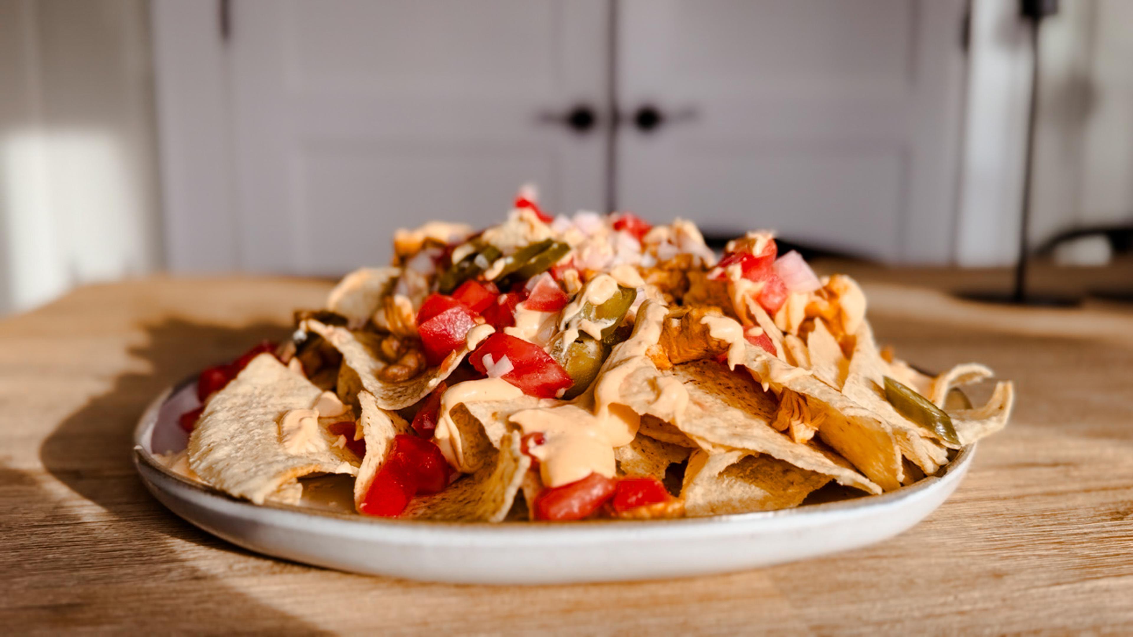 Often, nacho cheese sauces are heavily processed with stabilizers and preservatives to maintain their smooth texture for dipping and drizzling. This recipe features a cottage cheese-based cheese sauce that packs in filling protein and gut-healthy probiotics while reducing the overall saturated fat of the dish. The nachos are topped with an array of veggies and herb for a flavor punch.
