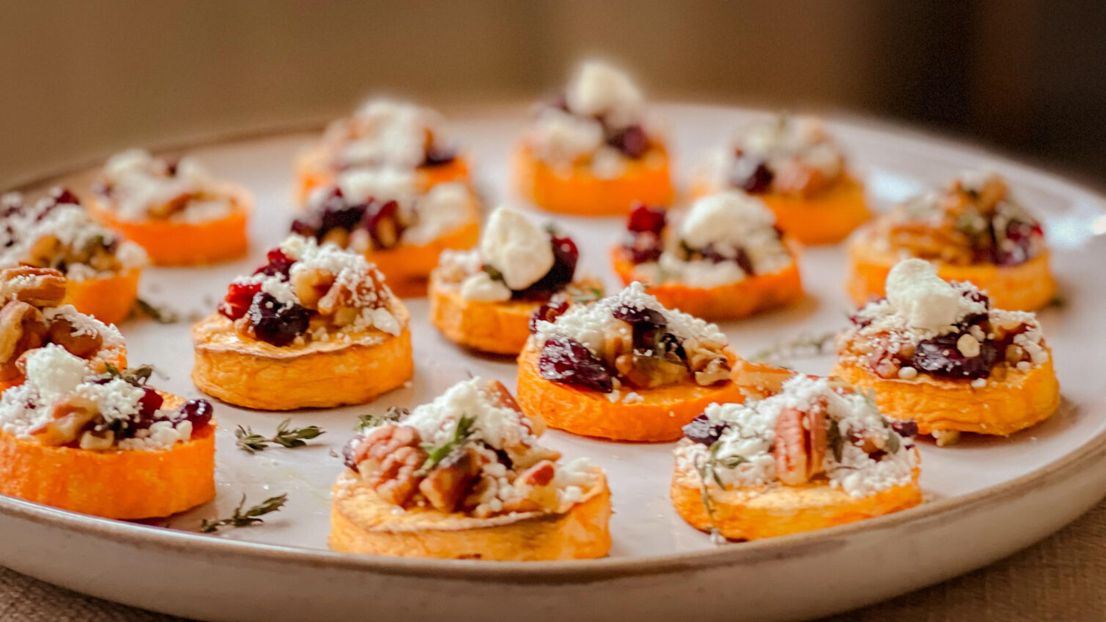 Whether you’re hosting or bringing a dish this Thanksgiving, consider making these savory and simple bites that serve up a flavorful punch of nutrients. Brushed with a maple syrup-and-herb mixture and roasted, these sweet potatoes develop complex flavors that pair excellent with their goat cheese and cranberry topping.