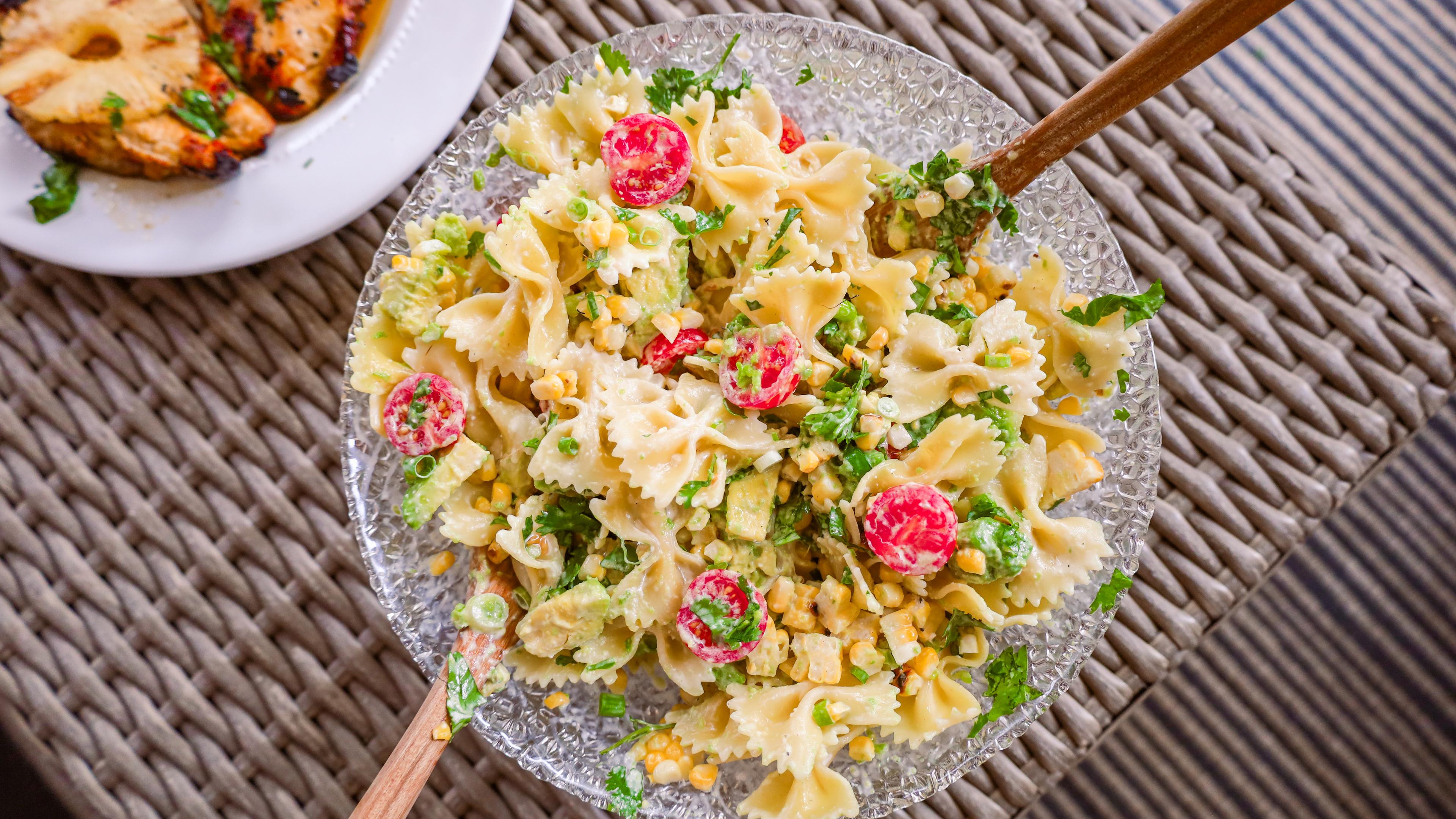 This dish combines the smoky sweetness of grilled corn with creamy avocado and pasta for a satisfying side. Tossed in creamy and zesty cilantro lime dressing, this salad offers a balance of textures and flavors. Corn packs in a healthy dose of fiber that helps boost satiety while avocado delivers heart-healthy fats. Enjoy with our pineapple jalapeño-marinated grilled chicken.
