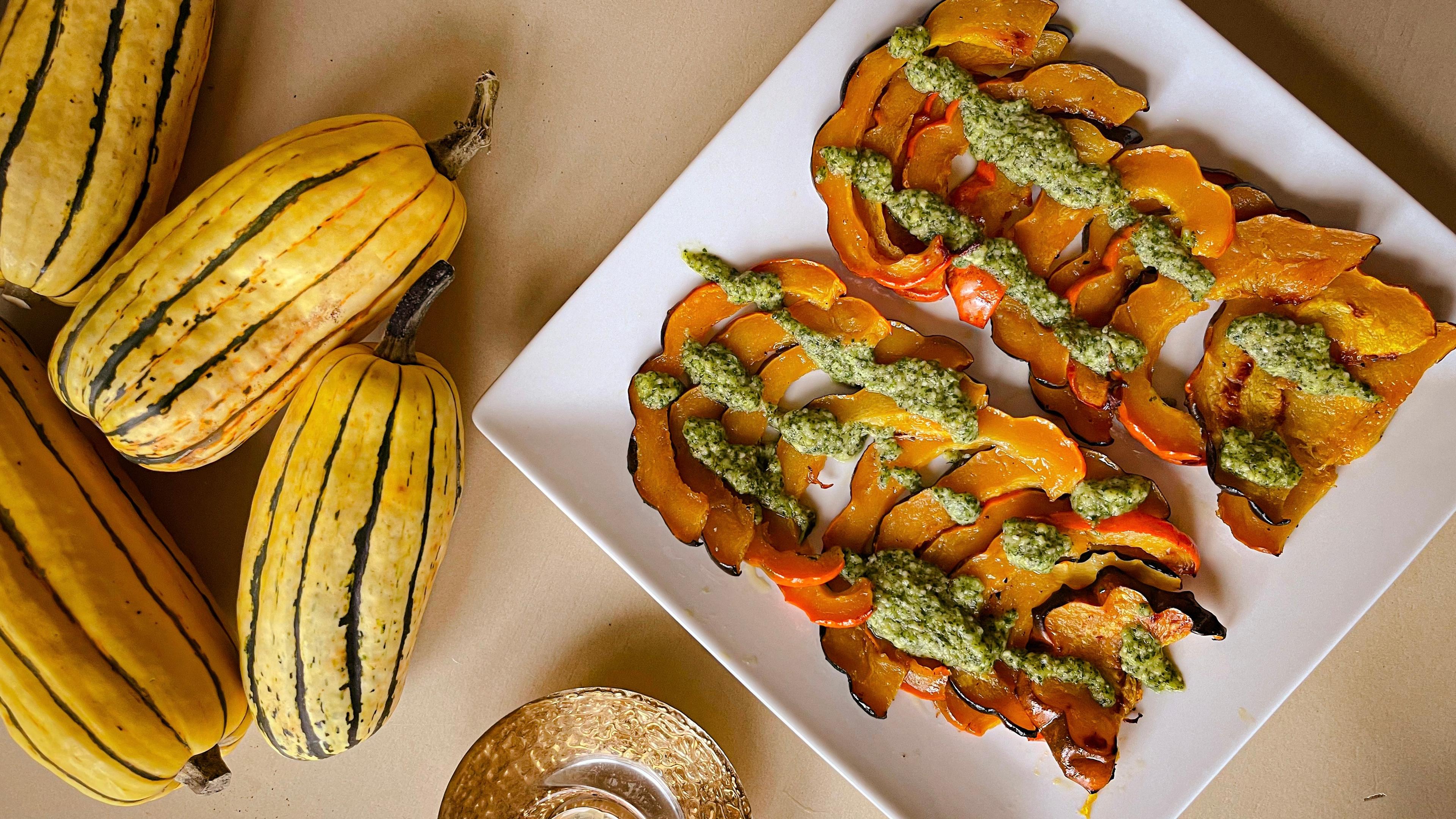 This recipe is an affordable crowd-pleaser using acorn squash and arugula for pesto. Substituting arugula for basil in this pesto recipe, along with using breadcrumbs instead of some or all of the pine nuts, offers unique and delicious flavors while reducing its calorie and fat content.