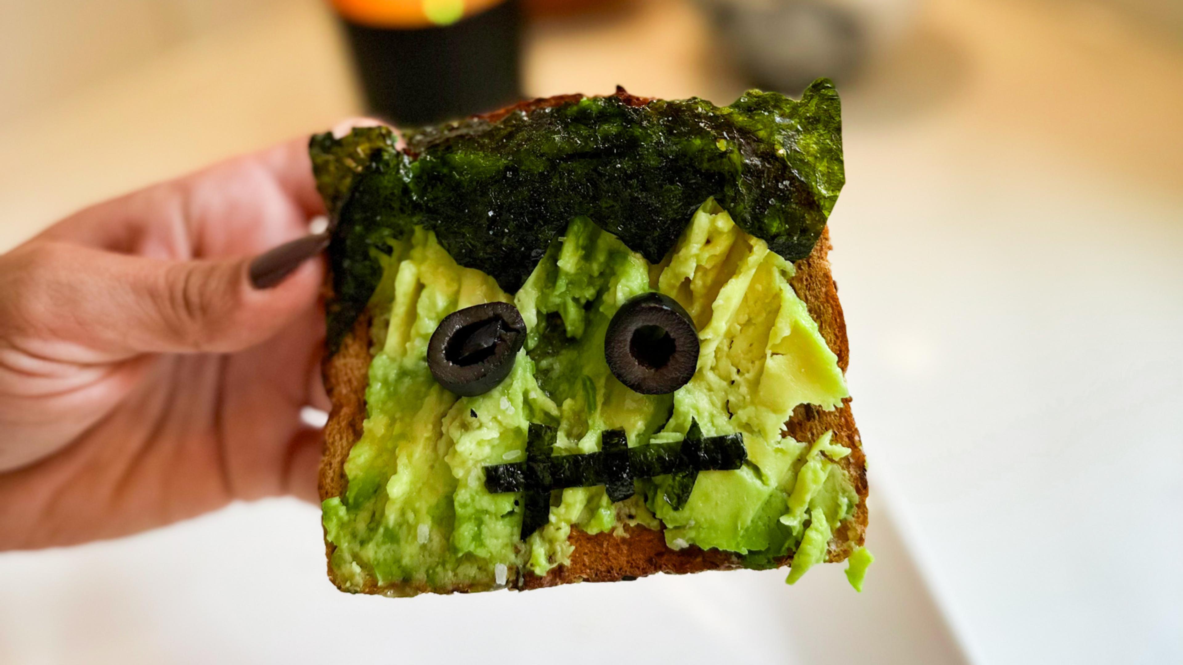 Avocado toasts are a staple healthy breakfast, especially when made with whole wheat, nut or seed-rich bread. The avocado packs in healthy fats and fiber while serving as a creamy topping. In this spooky rendition, seaweed snacks are trimmed to mimic Frankenstein’s hairdo and form a mouth. Sliced olives are used as eyes, but other veggies such as sliced cherry tomatoes are suitable options too.