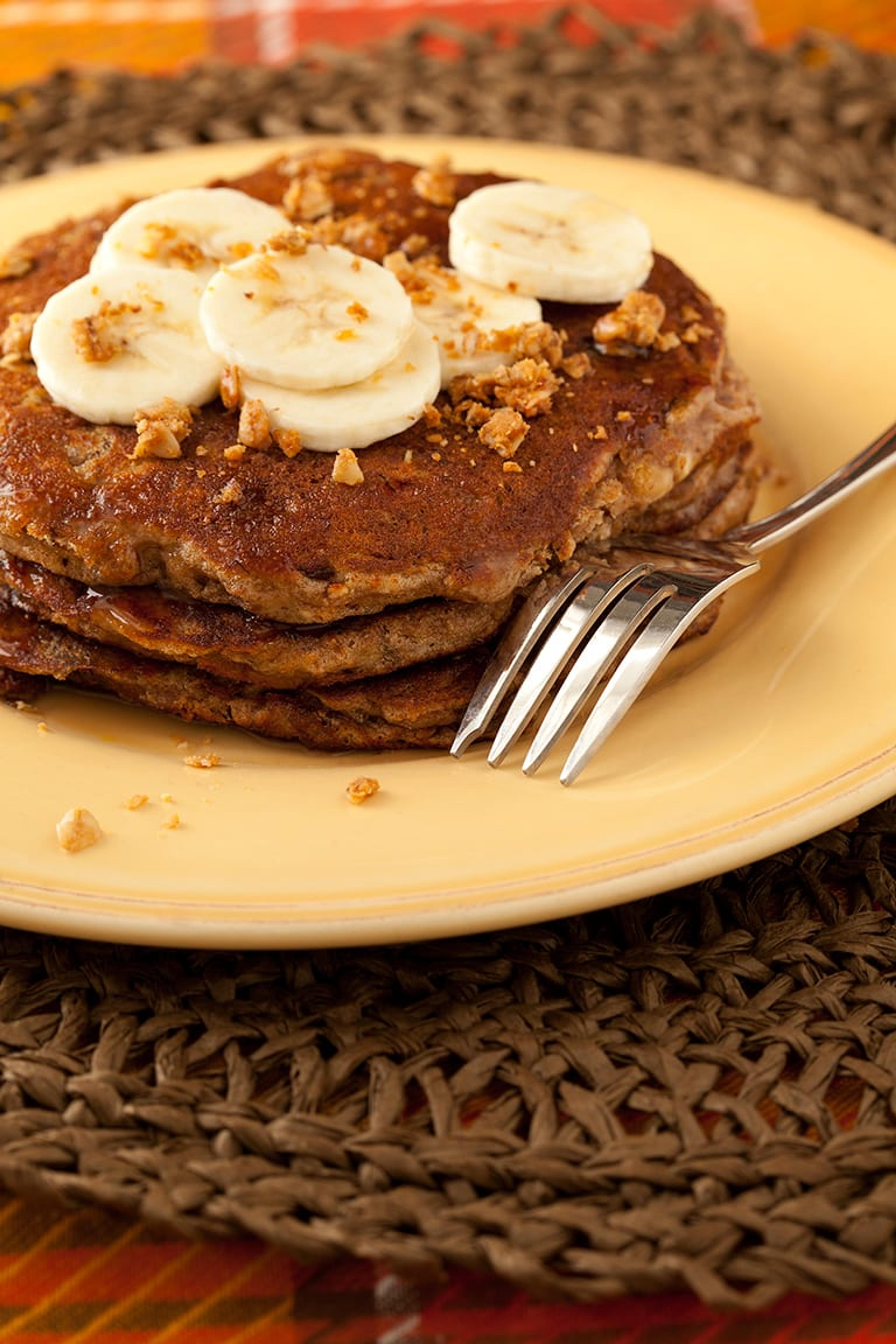 Spoon 1/4 cup of batter into the pan and allow to cook until the edges are set, about 3 minutes. You may need to adjust your heat up or down to get the perfect temperature to brown the pancakes and cook them thoroughly without burning them. When the edges are set, flip the pancakes and cook on the other side to golden brown.