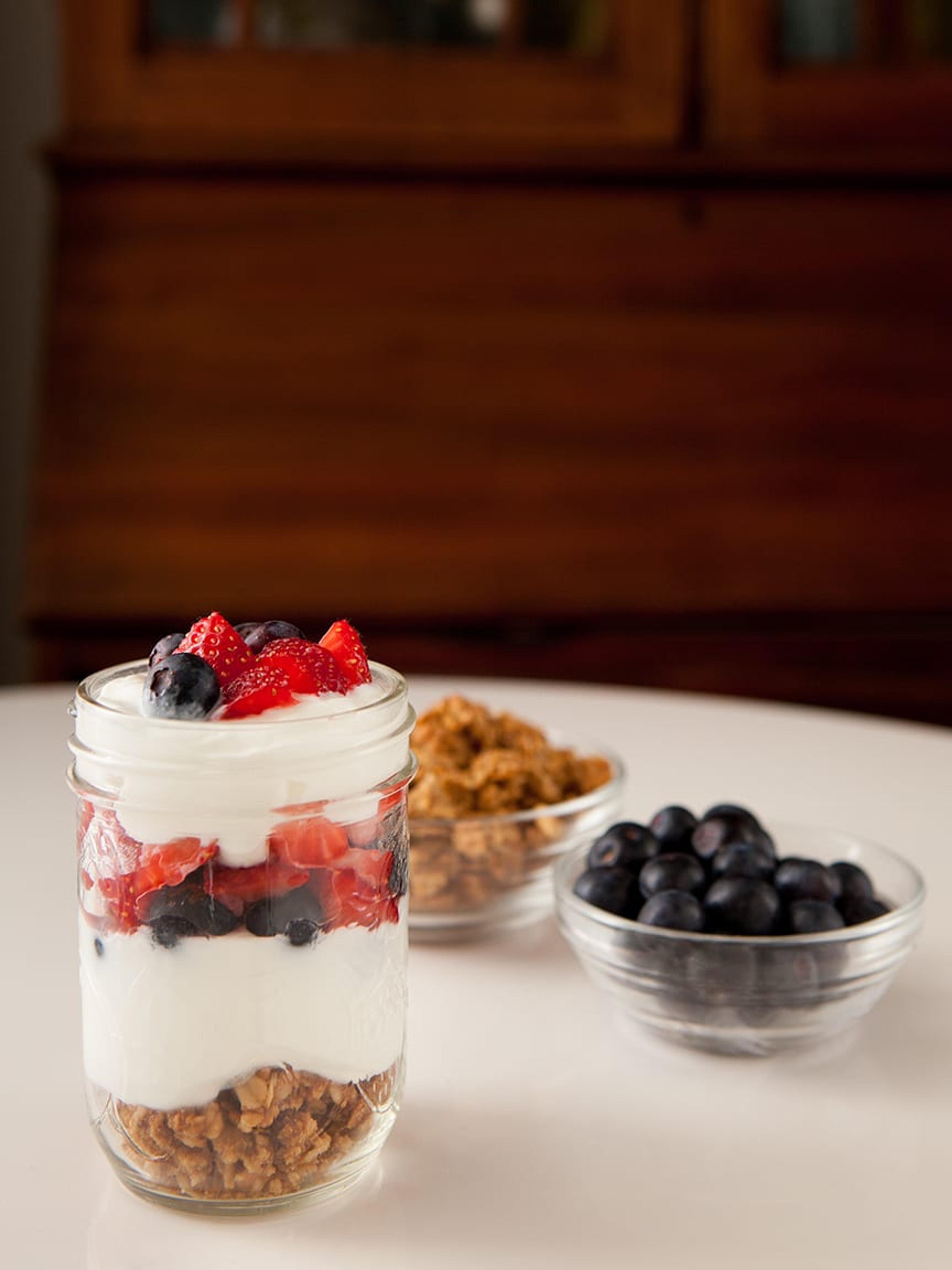 For Fruit and Yogurt in Jars: Spoon half of the sweetened berries into the bottom of two eight ounce mason jars. Spoon half of the sweetened yogurt over the top of the berries. Finish each portion with 2 tablespoons of granola, as desired.