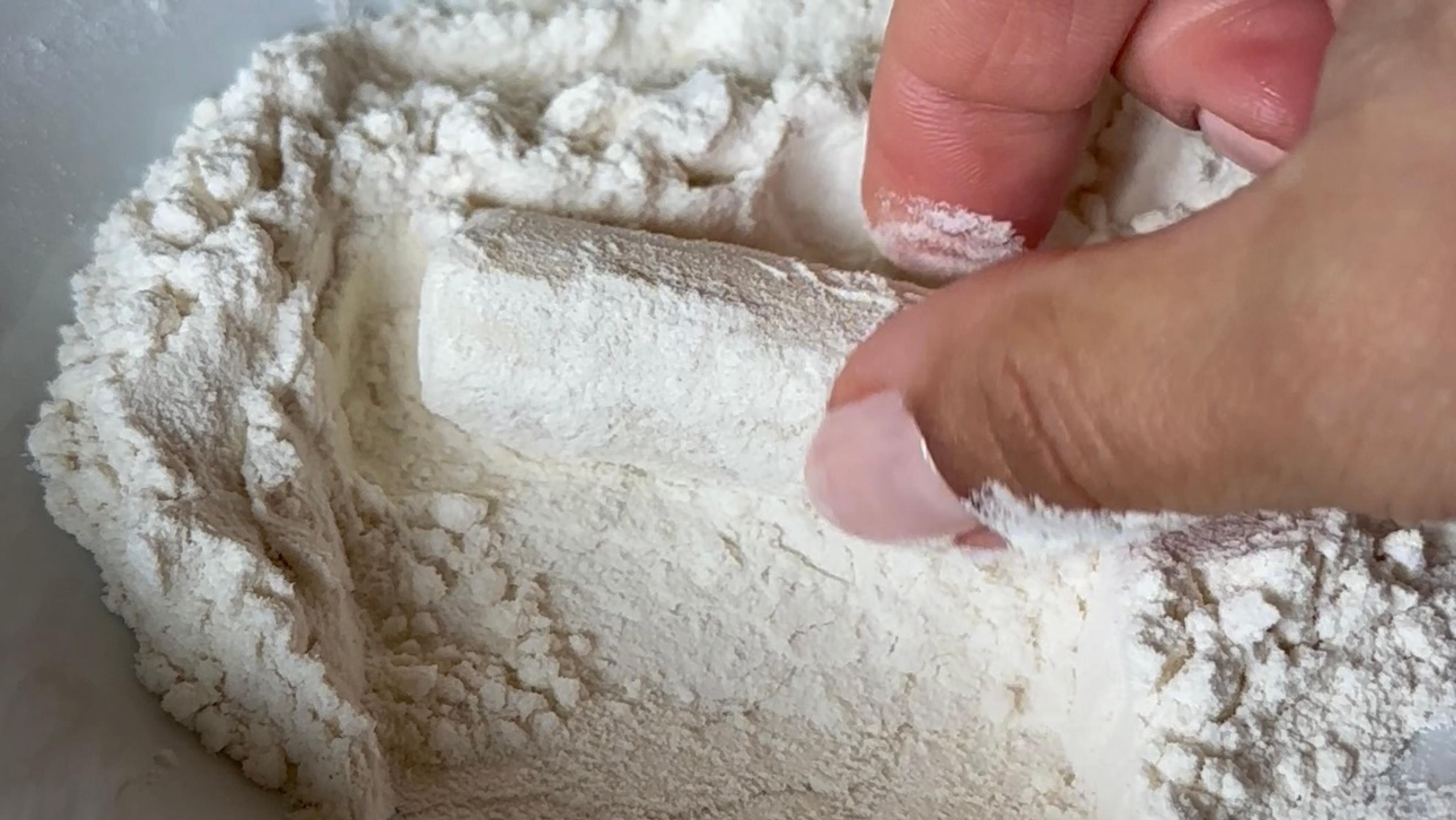 Gently press cheese stick into flour to coat, shaking off excess flour.