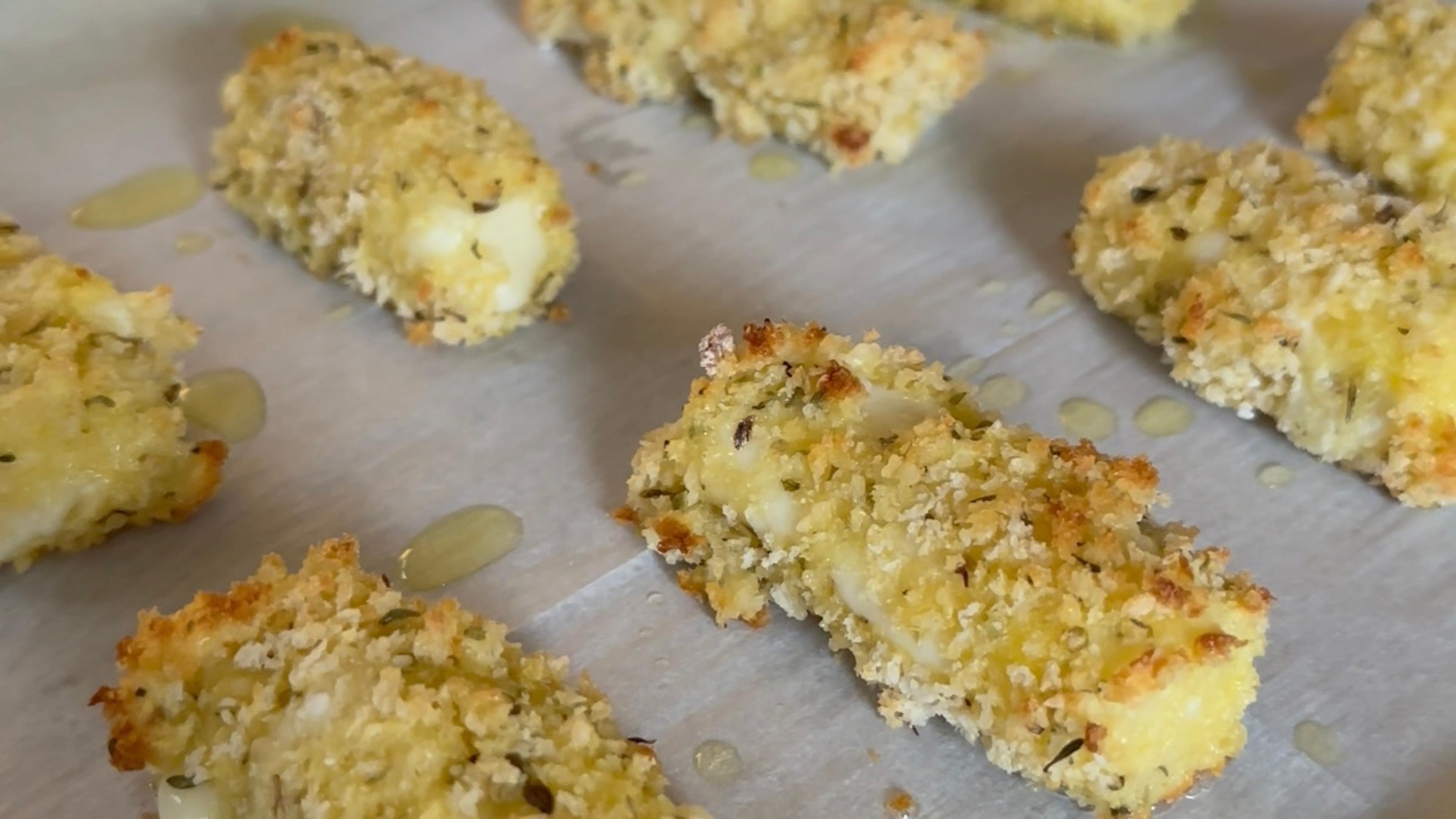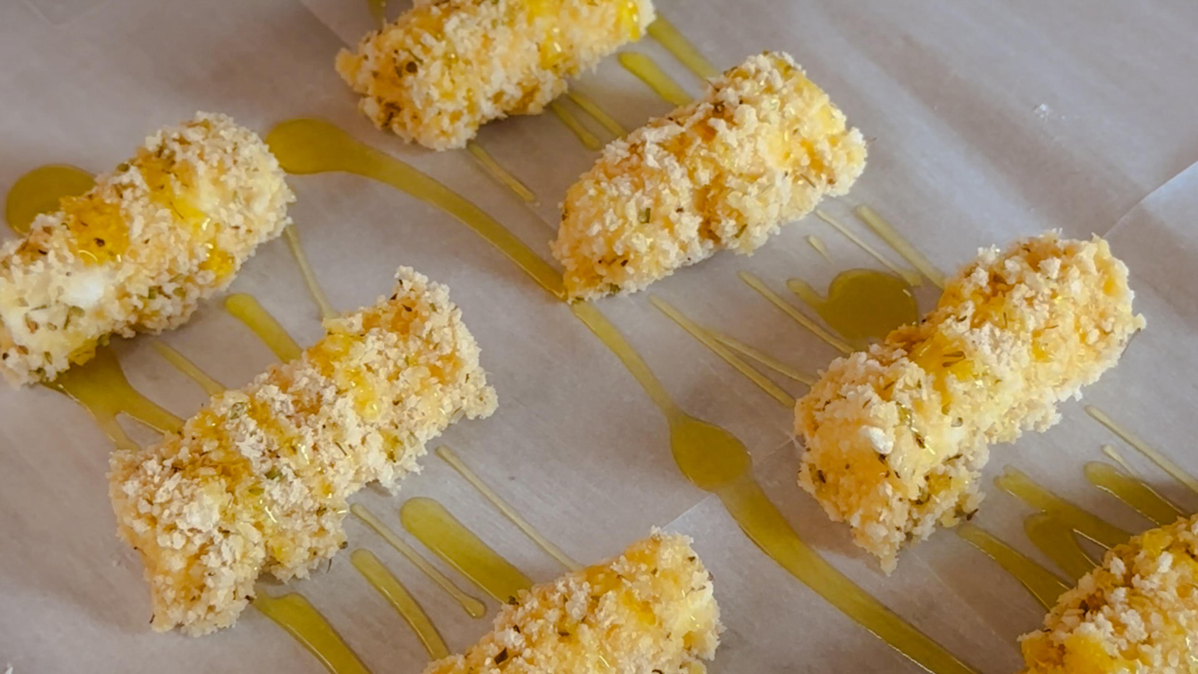 Place breaded sticks onto the baking sheet, then spray generously with oil or drizzle with olive oil.