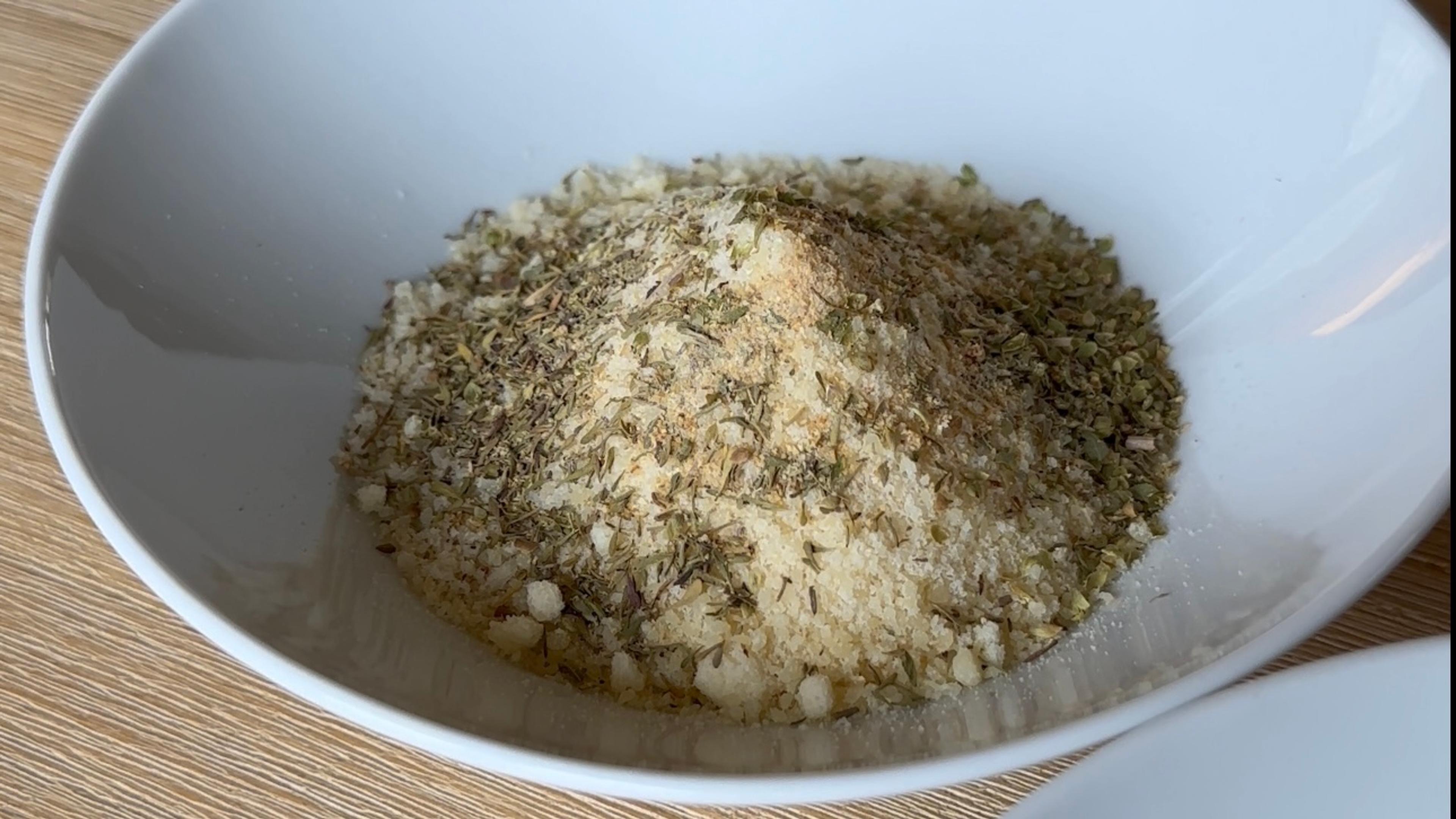 Prepare three bowls: one with flour, one with a beaten egg and one with the panko bread crumbs, Parmesan cheese and Italian seasoning mixed together.