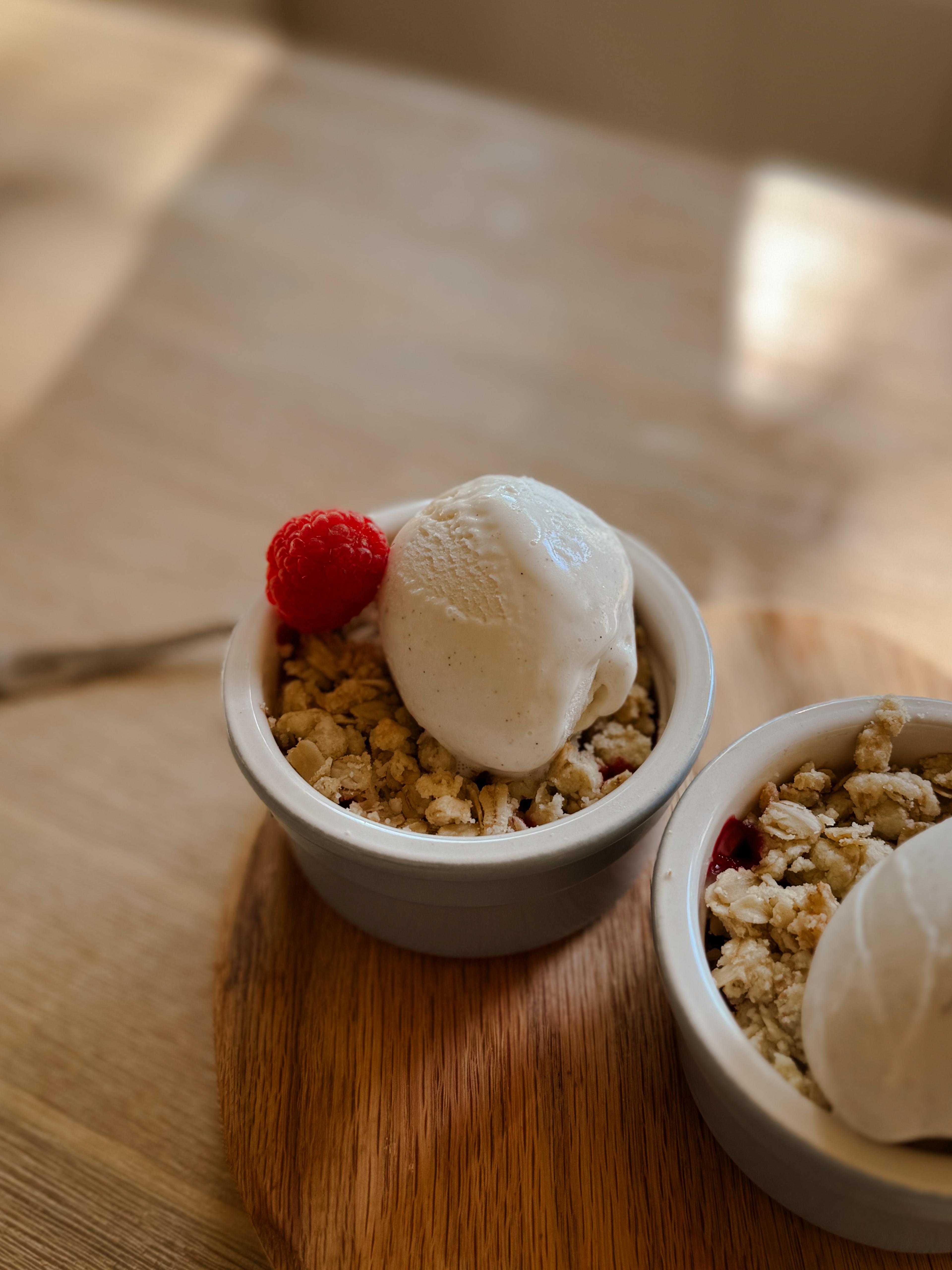 These single servings of raspberry crumble serve two and are perfect for those evenings when you want a little something sweet without overdoing it. If making a serving for one person, simply cut the ingredients in half.