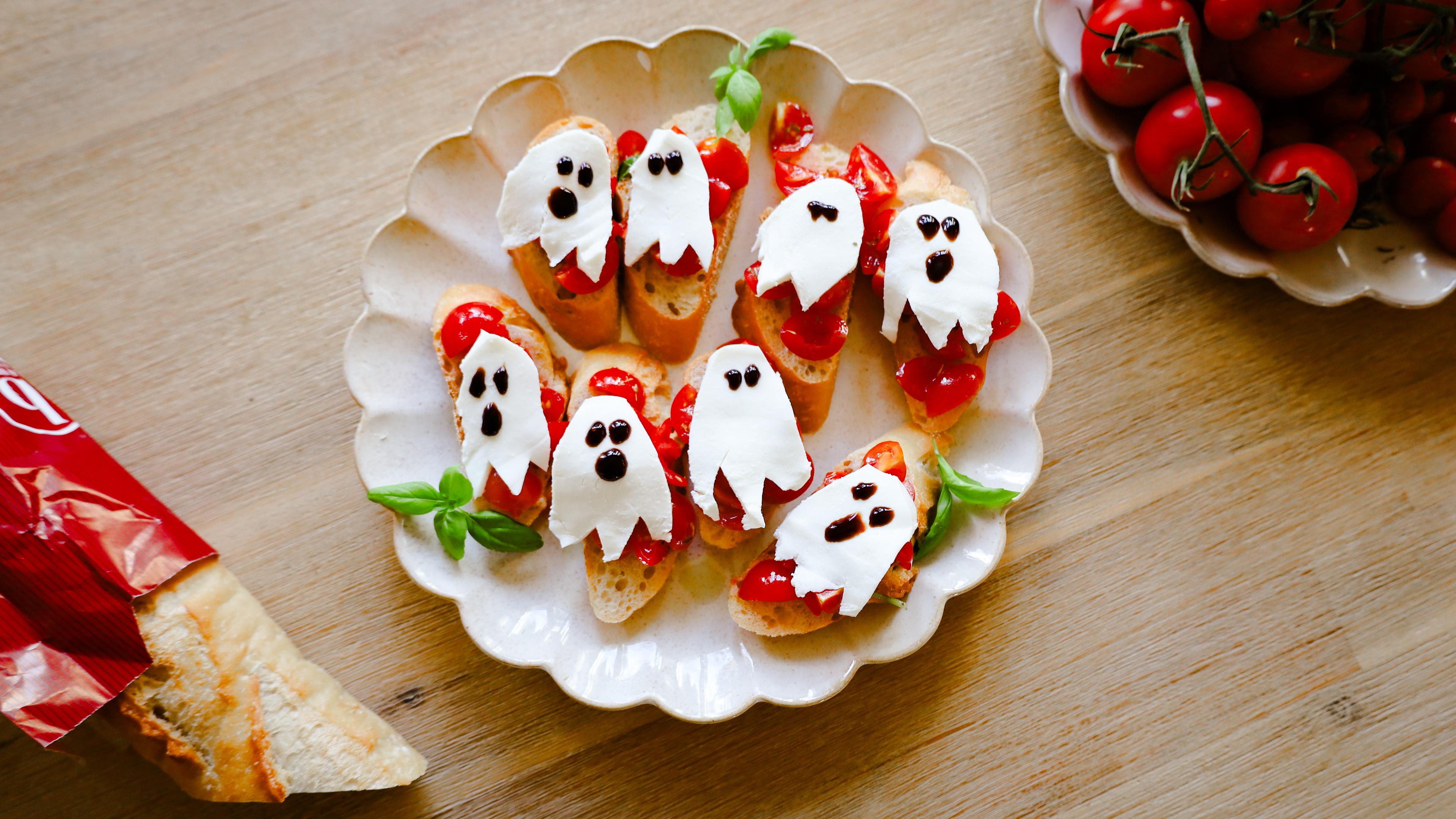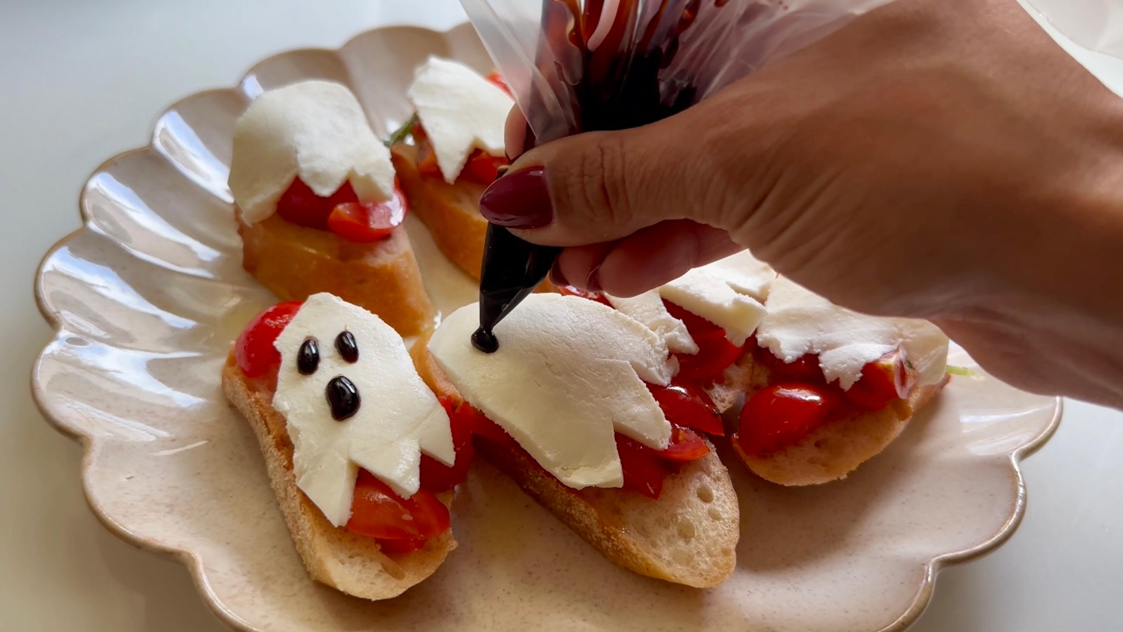 Place bruschetta mixture on top of toasted baguette slices and top with ghost mozzarella. Add balsamic reduction as eyes and mouth.