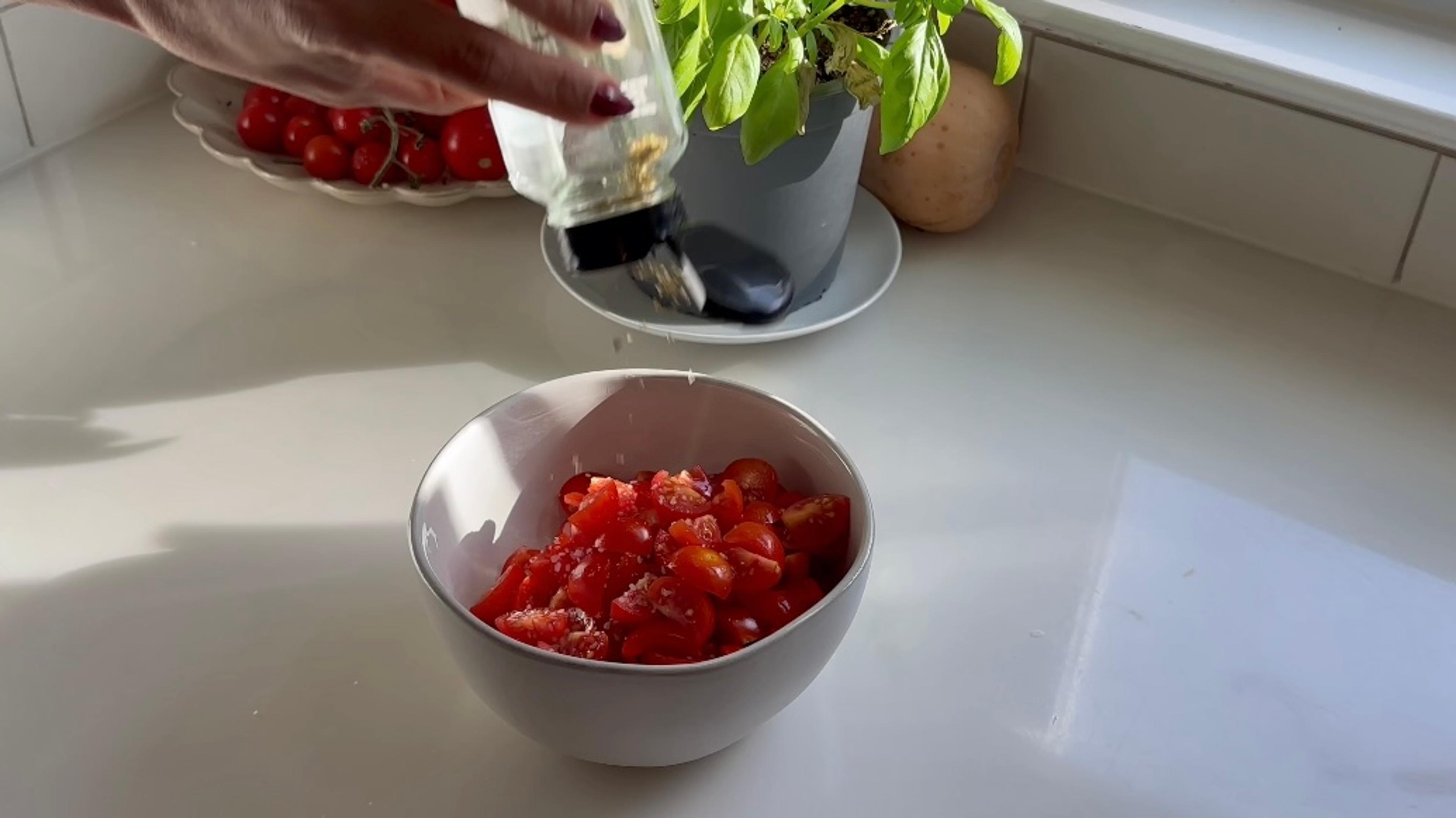 In a bowl, combine cherry tomatoes with olive oil and dust with salt, pepper and oregano. Mix until well-combined. The bruschetta will continue to develop flavors and is best served at room temperature at least 20 minutes after preparation.