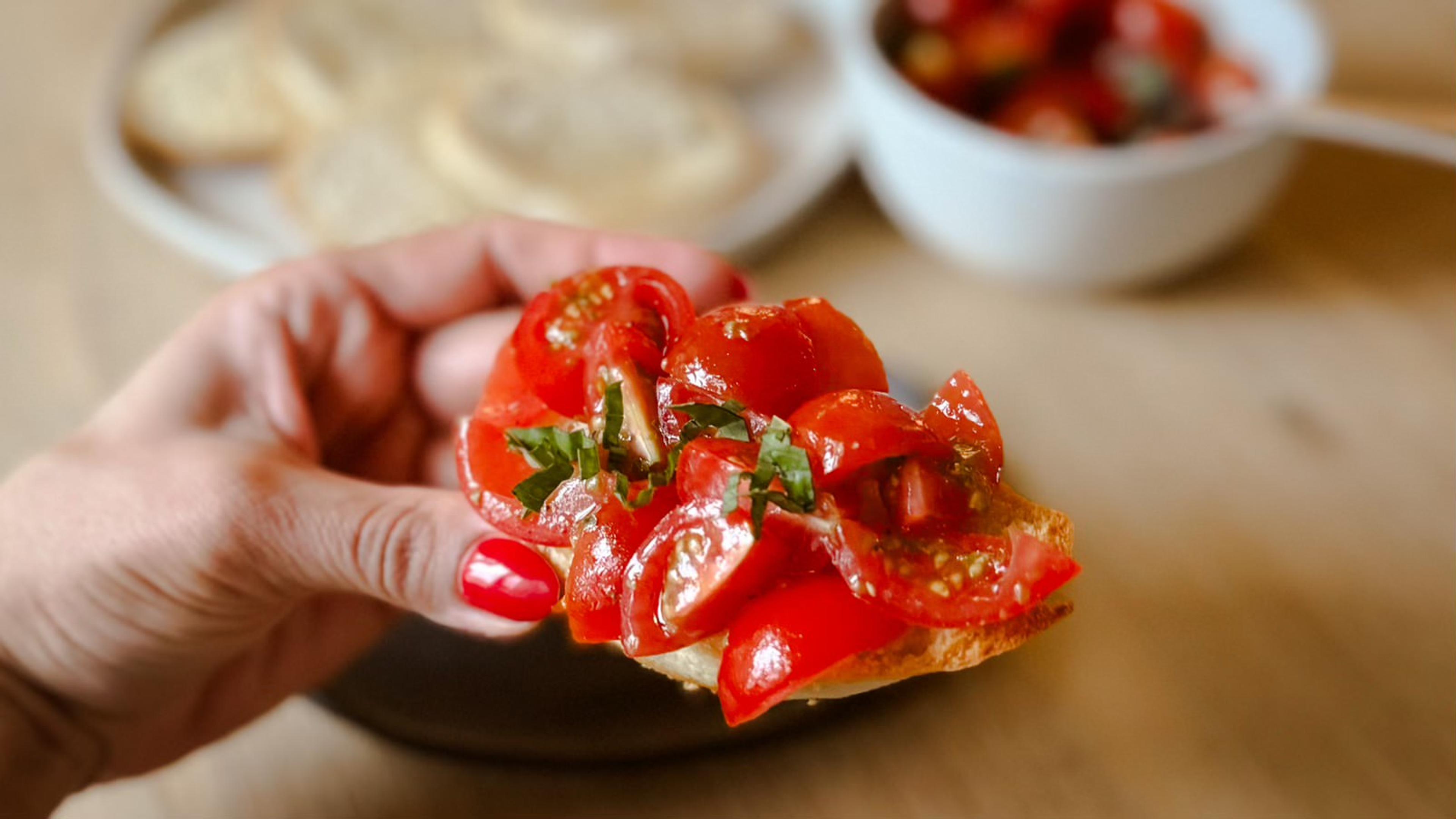 Top each toasted baguette slice with the tomato mixture and serve immediately.