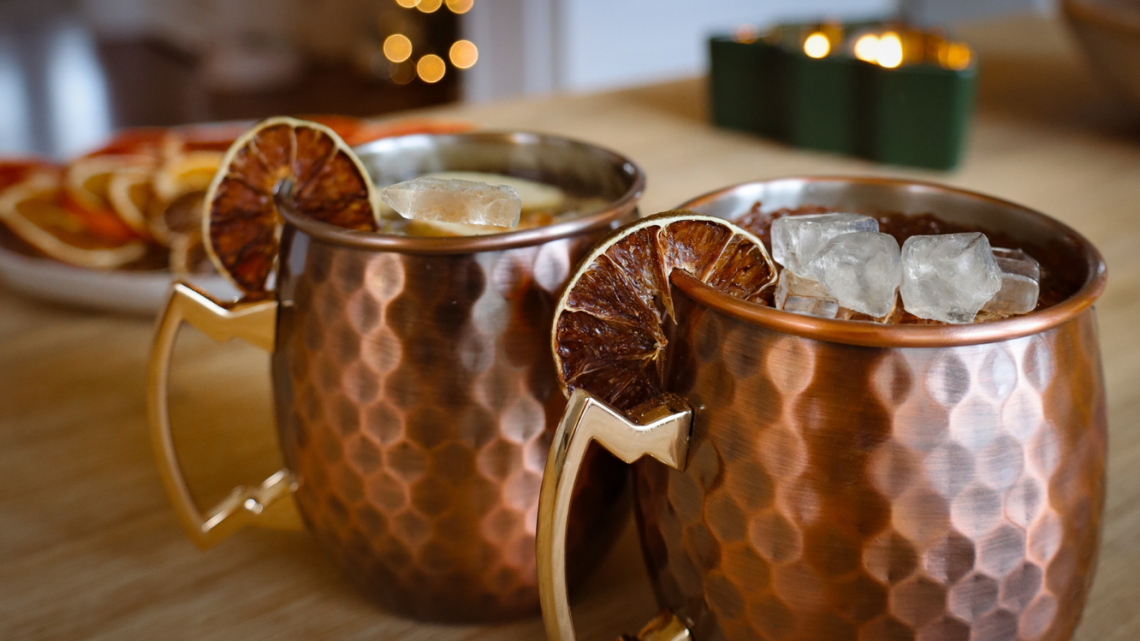 This cozy drink features a balance of tart and sweet, with a hint of gingery spice. Allow frozen cranberries to double as ice and decorate with a dried citrus wheel.