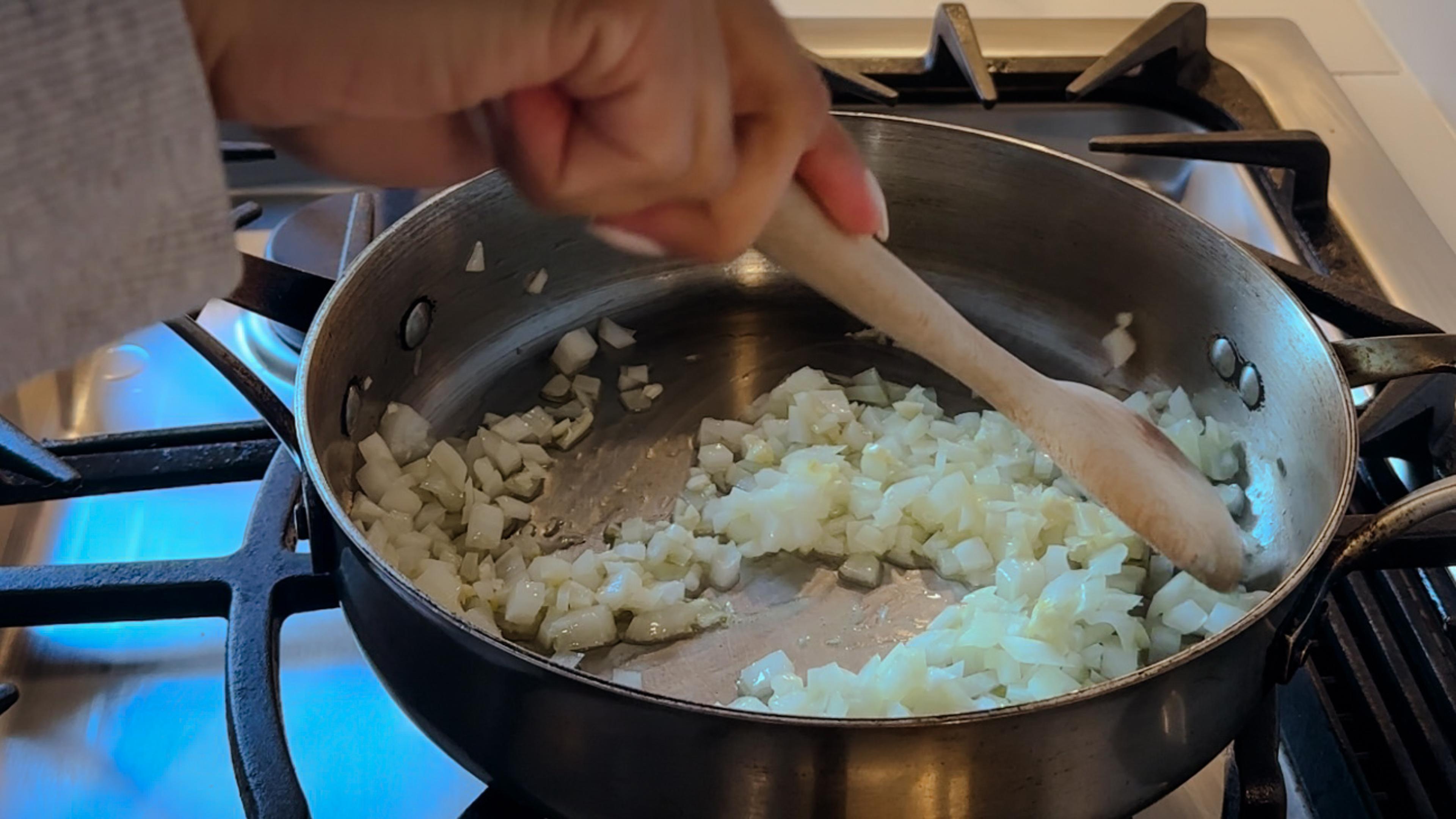 In a large pan over medium low heat, add olive oil. Once oil is warm, add onion and garlic and sauté until fragrant.