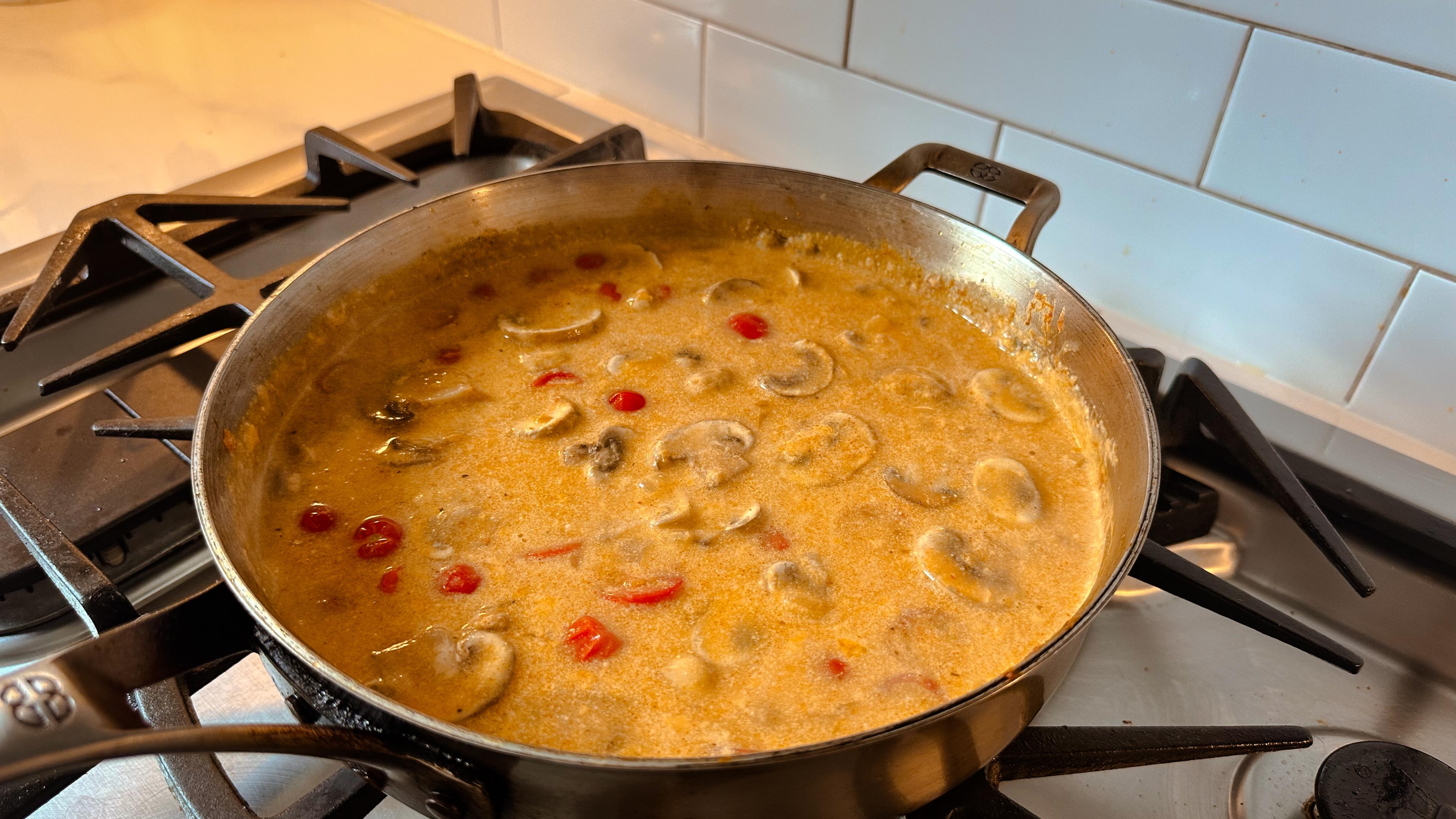 Turn the temperature up to medium, add curry paste and allow it to sauté for about 5 minutes with the garlic and onions. Add mushrooms and sauté until lightly softened. Add coconut milk and brown sugar and stir. Allow to simmer for about 10 minutes, then add cherry tomatoes and cook for another 5 minutes. Add lime and salt to taste. Stir.