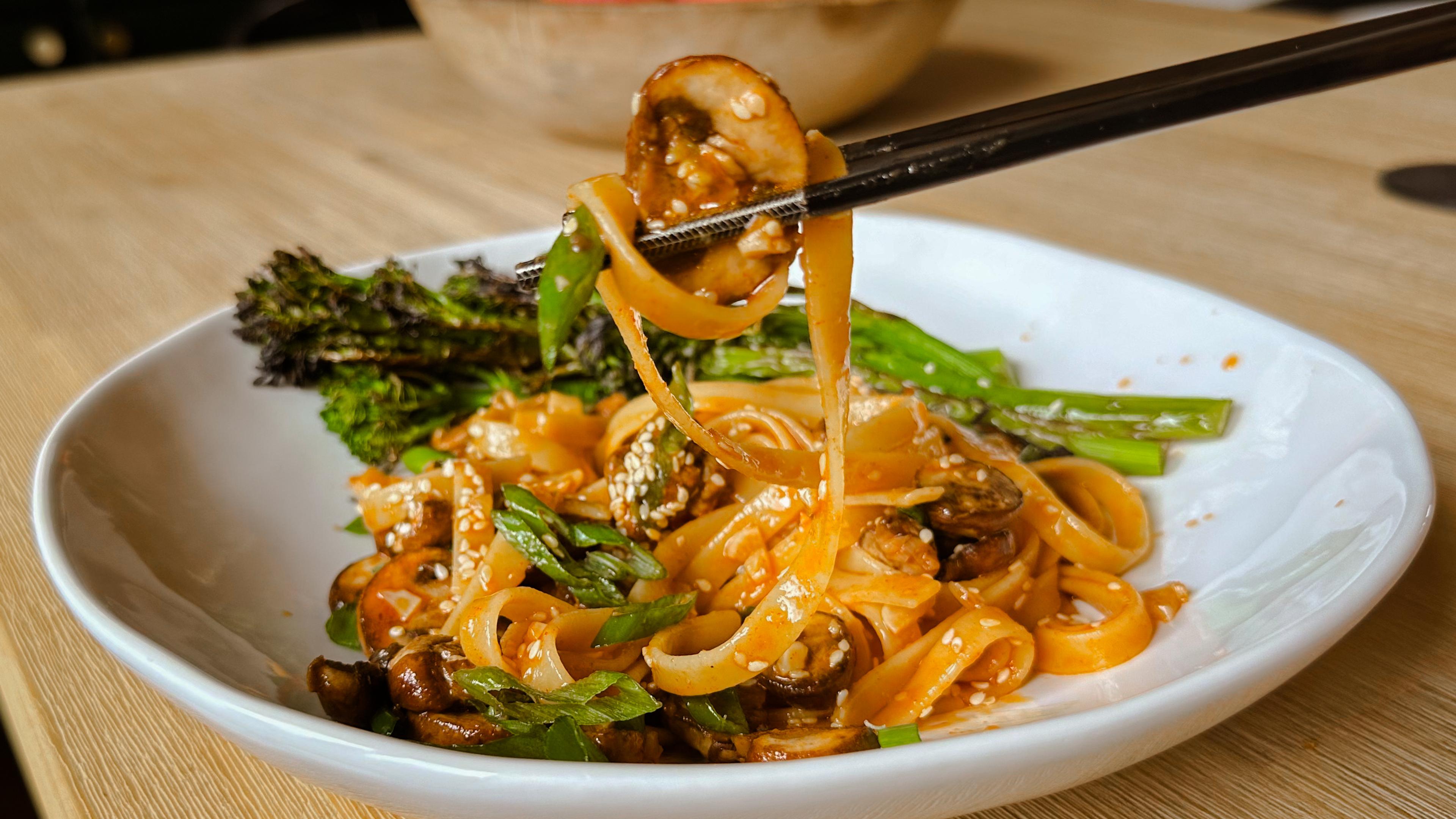 Crispy Broccolini and Mushrooms with Gochujang Noodles
