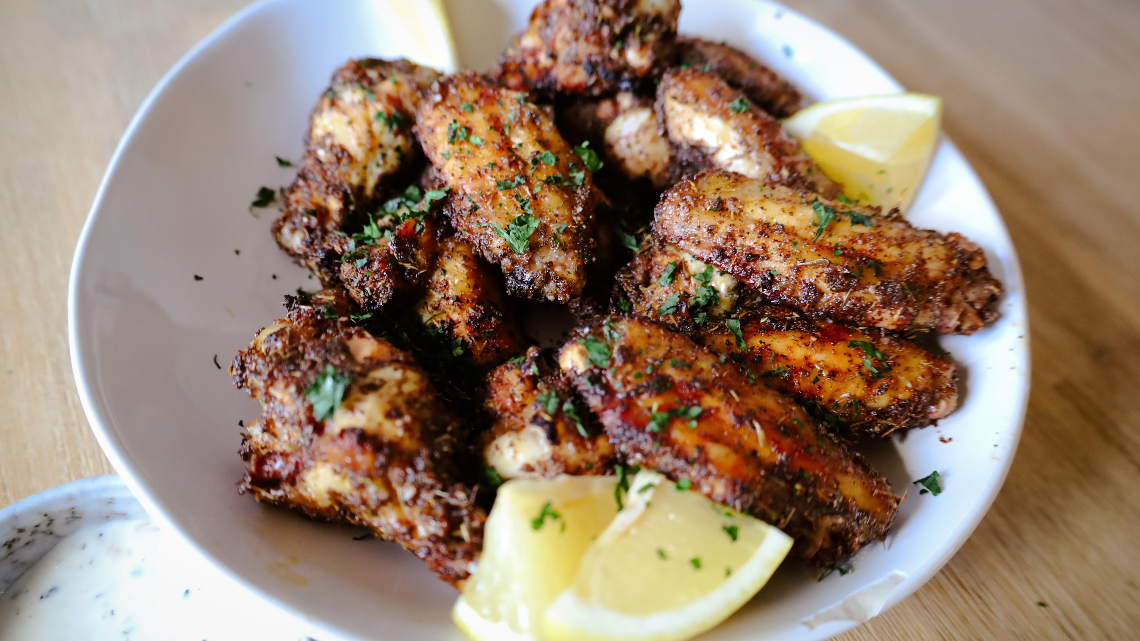 Garnish the wings with chopped parsley and serve with lemon wedges and dipping sauce, such as ranch or lemon tahini sauce.