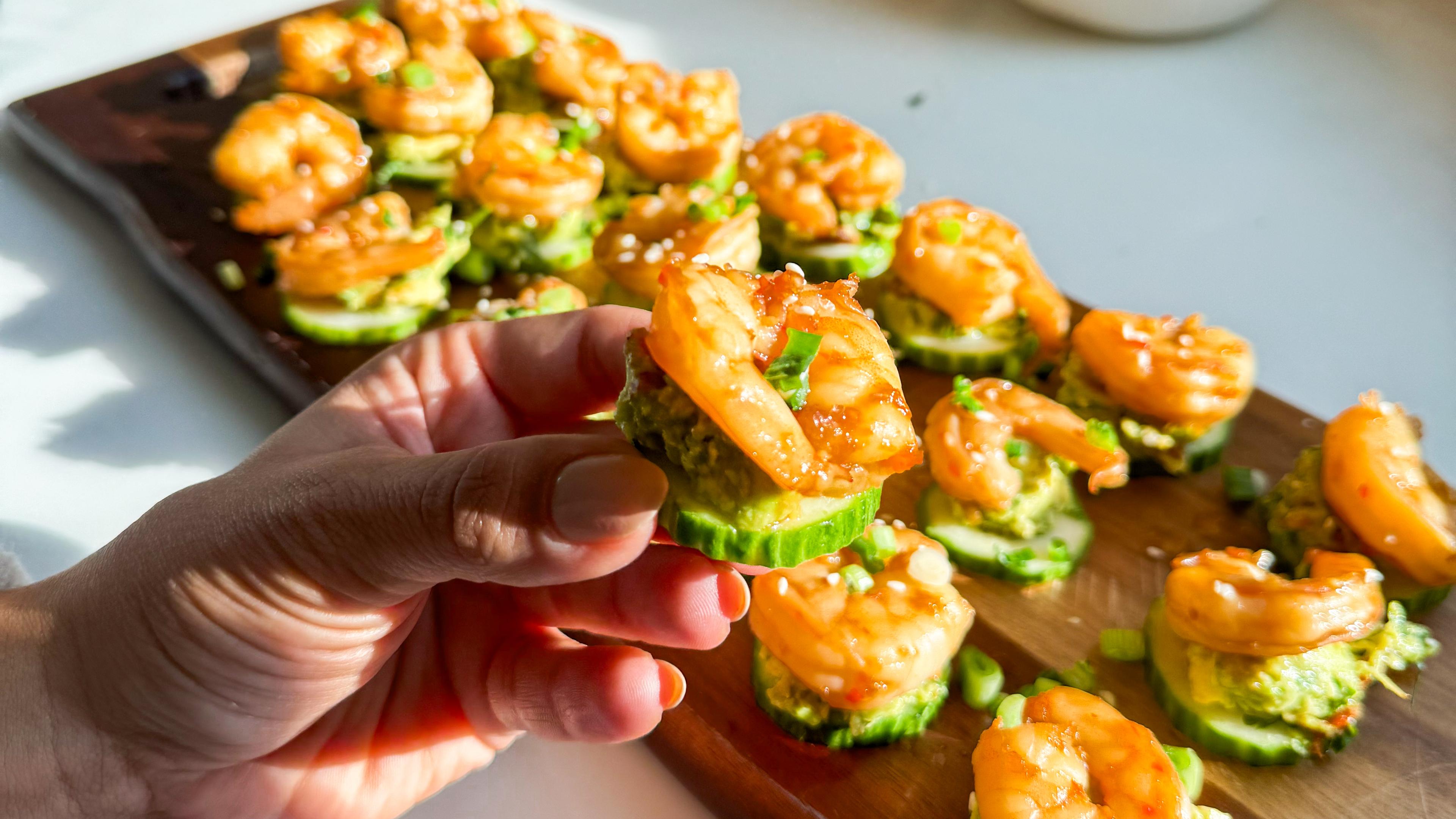 On a cucumber slice, add ~1 Tbsp. of the avocado mixture followed by a shrimp, green onion and lime juice. Enjoy!